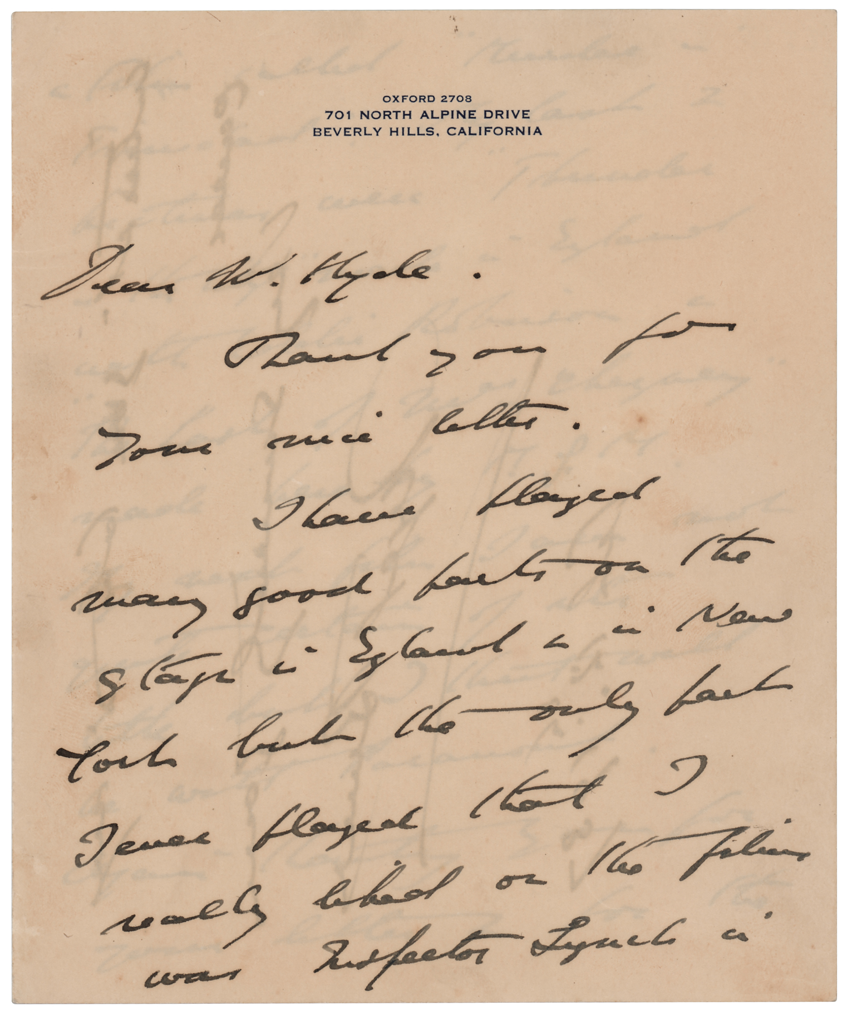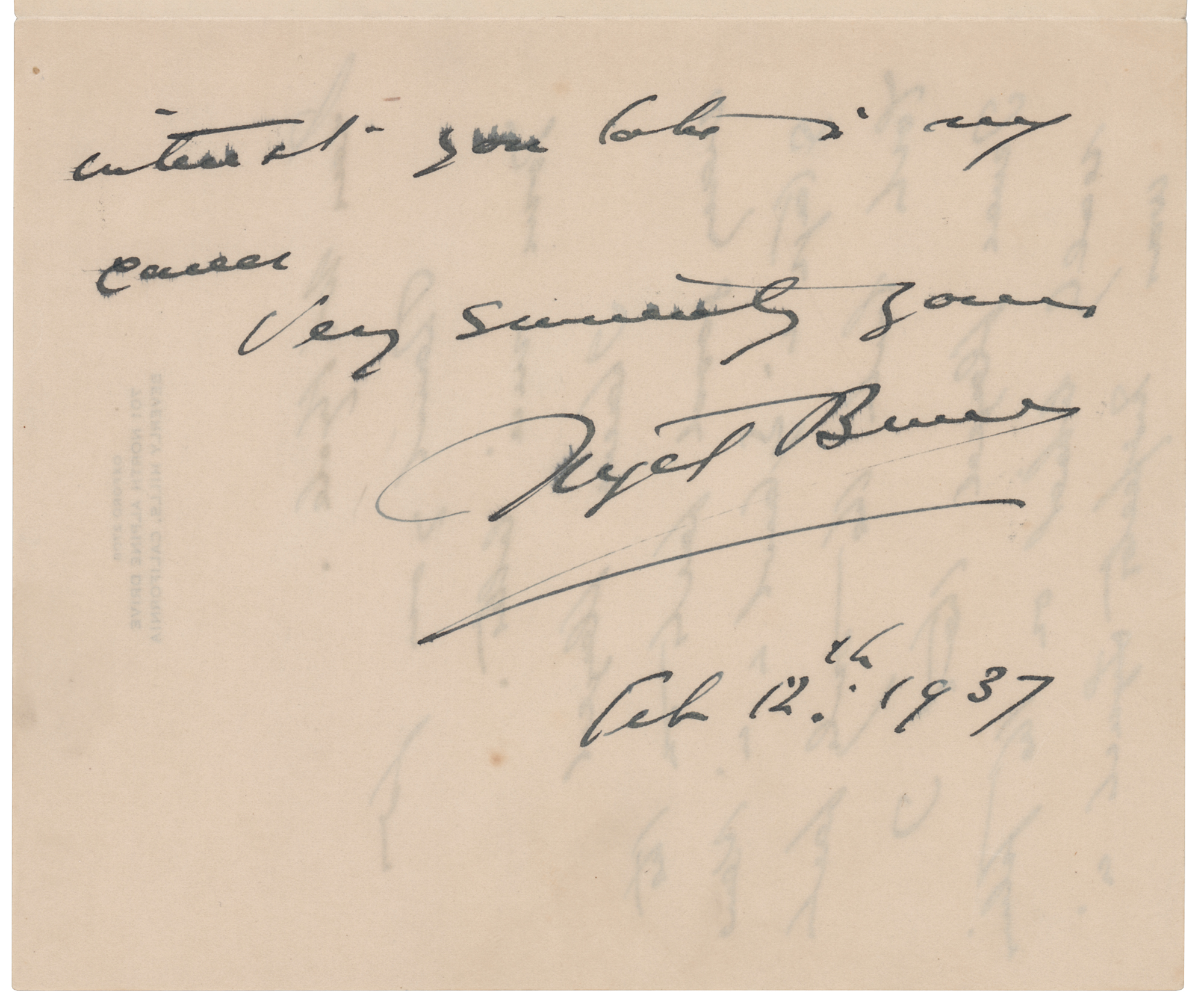 British character actor (1895-1953) best known for his frequent role as Dr. Watson opposite Basil Rathbone as Sherlock Holmes. ALS, three pages on two adjoining sheets, 5.5 x 6.75, personal letterhead, February 12, 1937. An interesting letter to a fan mentioning several of his films. In part: "Thank you for your nice letter. I have played many good parts on the stage in England & in New York but the only part I ever played that I really liked on the films was Inspector Lynch in a film called 'Murder in Trinidad.' My last 2 pictures were 'Thunder in the City' made in England with Eddie Robinson & 'The Last of Mrs. Cheyney' made here by MGM." In fine condition.