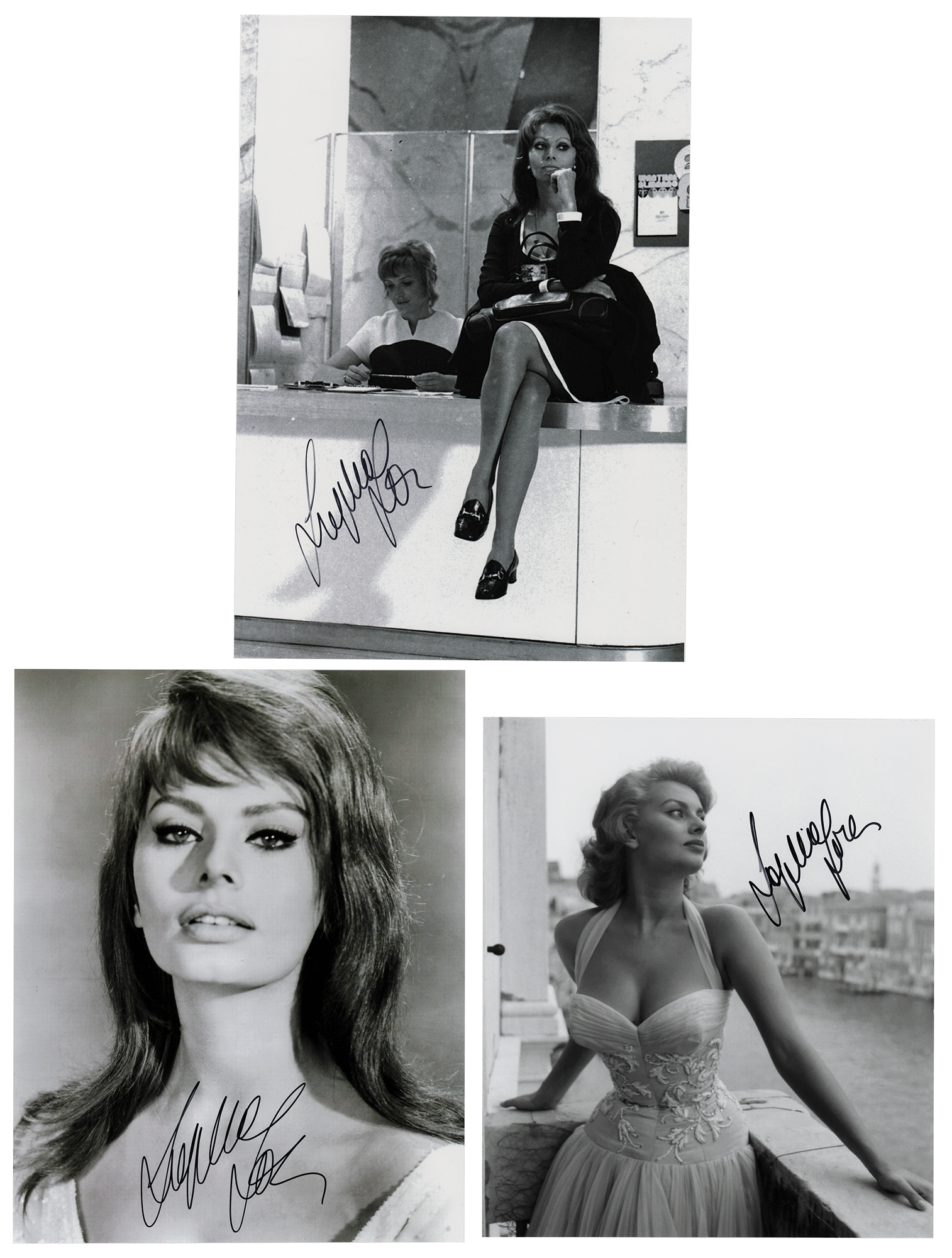 Three glossy photos of Italian actress Sophia Loren, ranging in size from 8 x 9 to 8 x 11.25, each boldly signed in black felt tip by the beautiful Hollywood star. In overall fine condition.