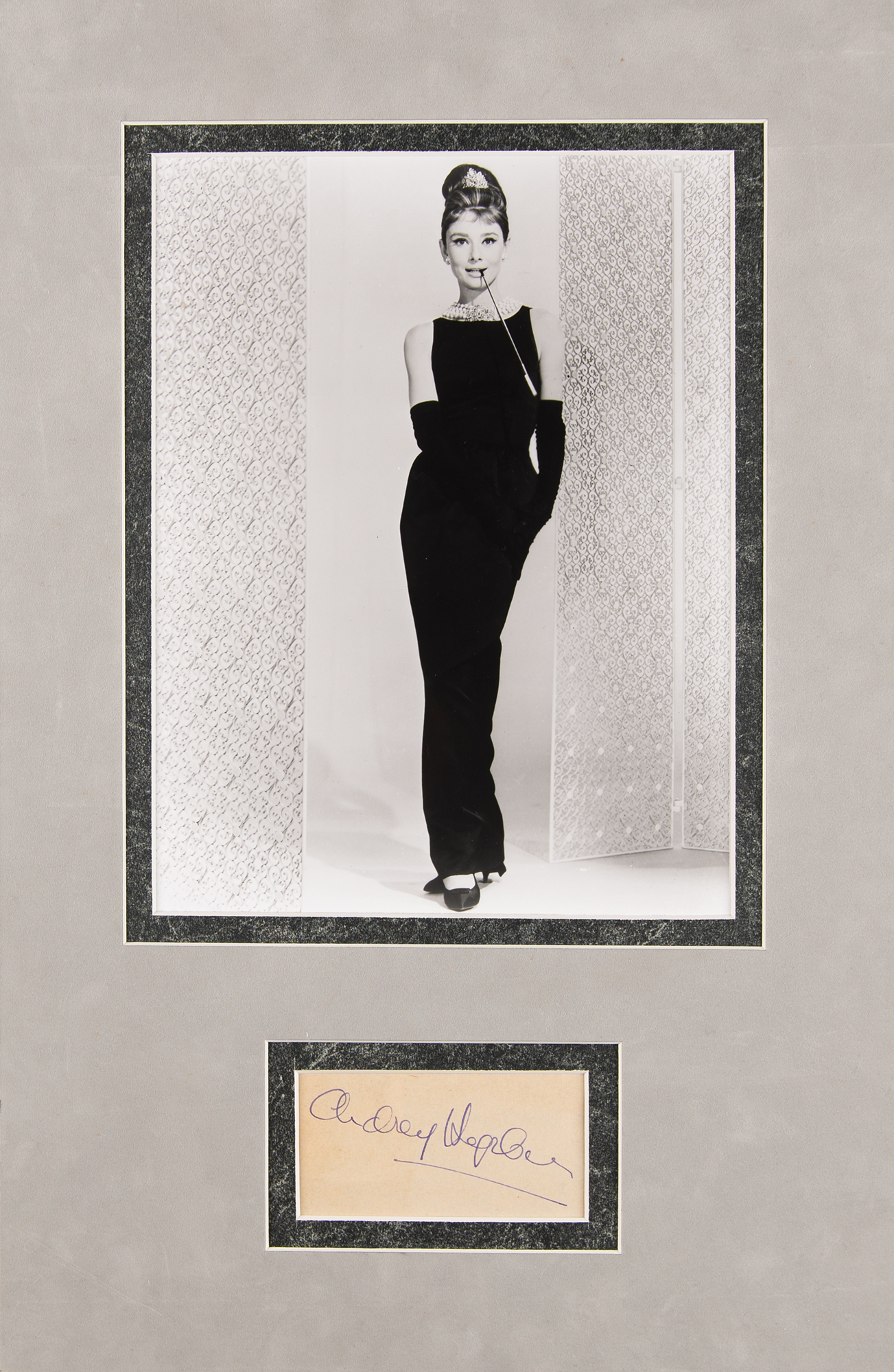 Vintage fountain pen signature, "Audrey Hepburn,” on an off-white 3.5 x 1.75 slip, attractively double-matted and framed with a full-length portrait to an overall size of 11 x 17. In fine condition.