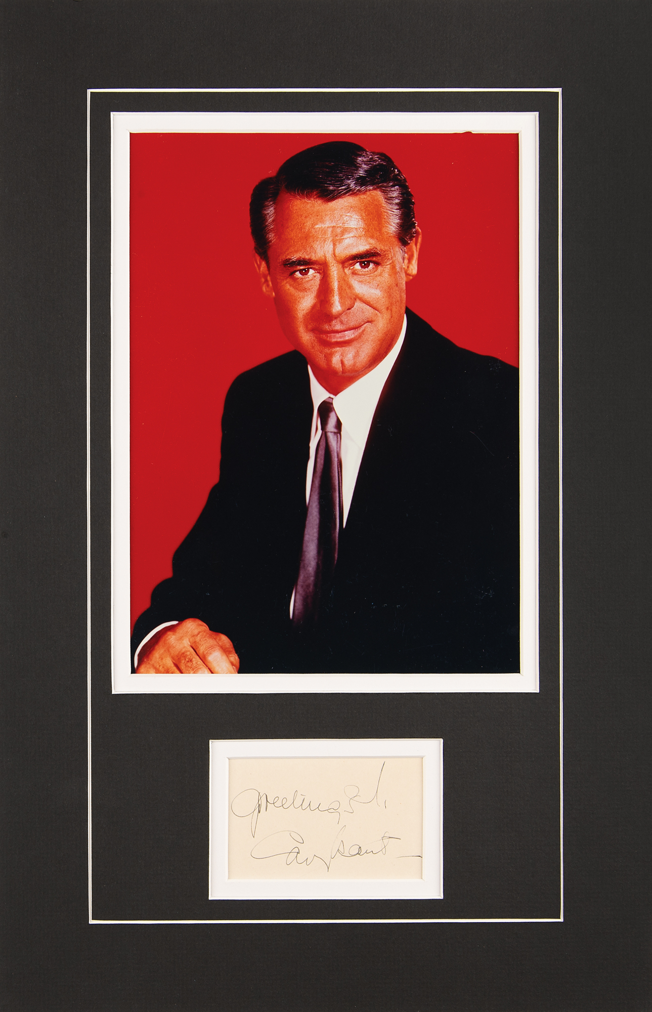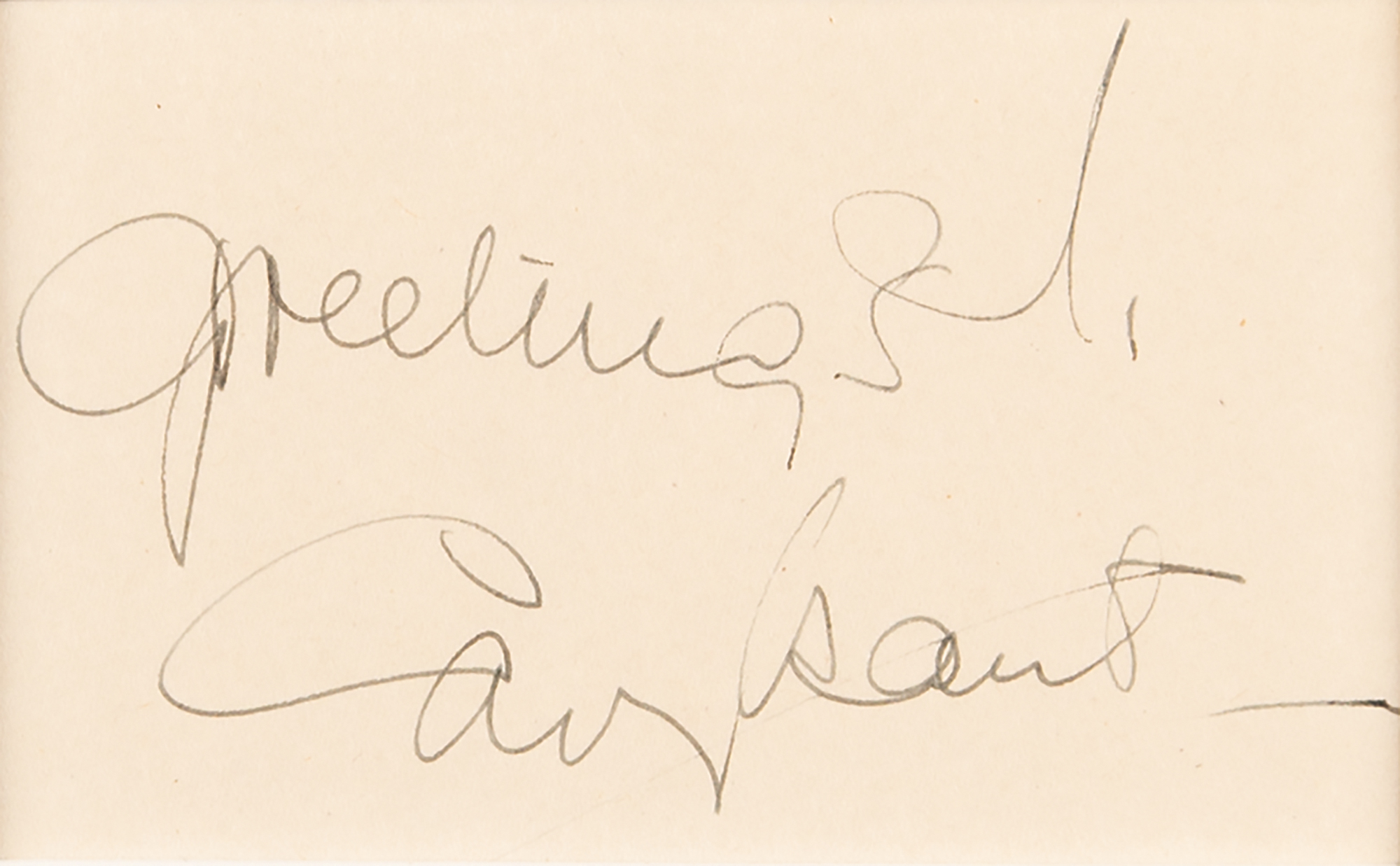 Vintage fountain pen signature, "Greetings! Cary Grant,” on an off-white 3.25 x 2 slip, handsomely double-matted and framed with a portrait to an overall size of 11 x 17. In fine condition.