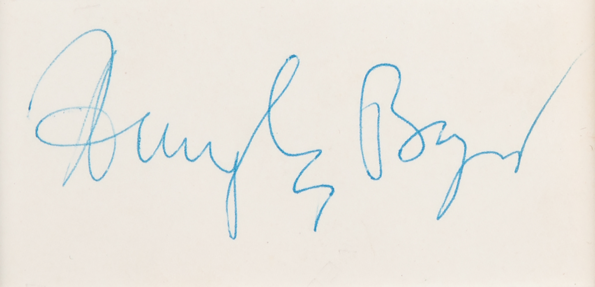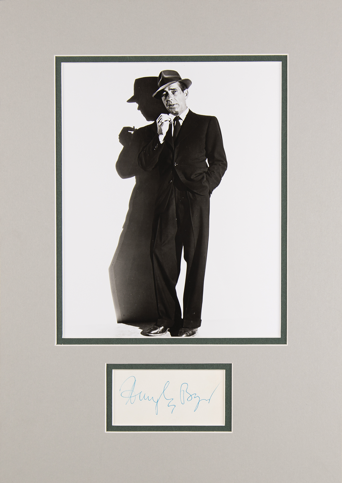 Vintage ballpoint signature, "Humphrey Bogart,” on a white 4 x 2 slip, attractively double-matted and framed with a full-length portrait to an overall size of 12 x 17. In fine condition.