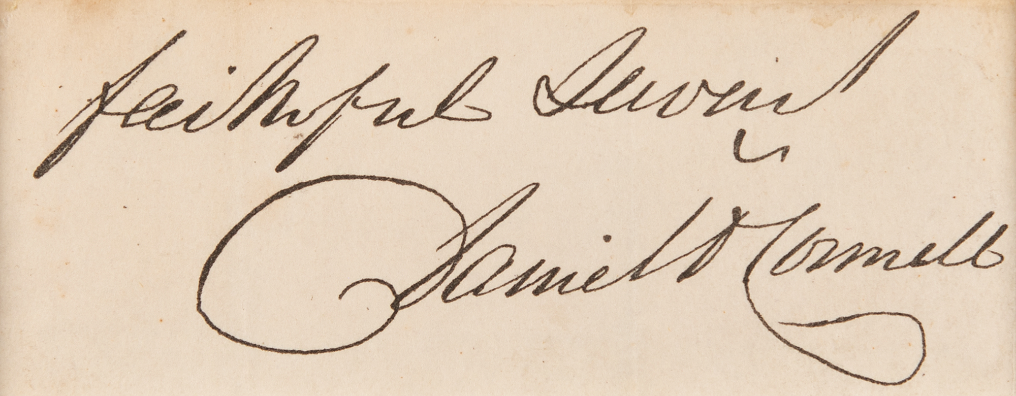 Irish political leader (1775-1847) best known for his tireless efforts on behalf of Catholic Emancipation and the repeal of the Act of Union which combined Ireland and Great Britain. Ink signature, "faithful servant, Daniel O'Connell,” on an off-white 3 x 1.25 sheet clipped from the close of a letter, which is double-matted with a portrait photo to an overall size of 9.75 x 14. In fine condition.