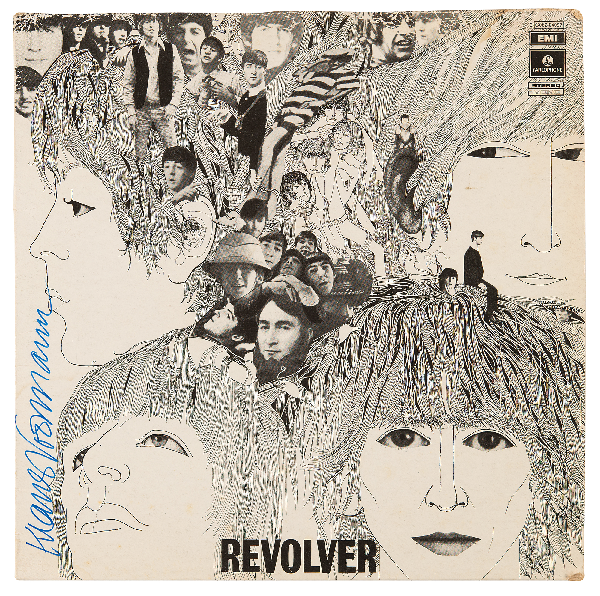 Revolver album by the Beatles, signed on the front cover vertically in blue felt tip by its designer, Klaus Voormann. In fine condition, with some faint foxing and rippling. The record is included.