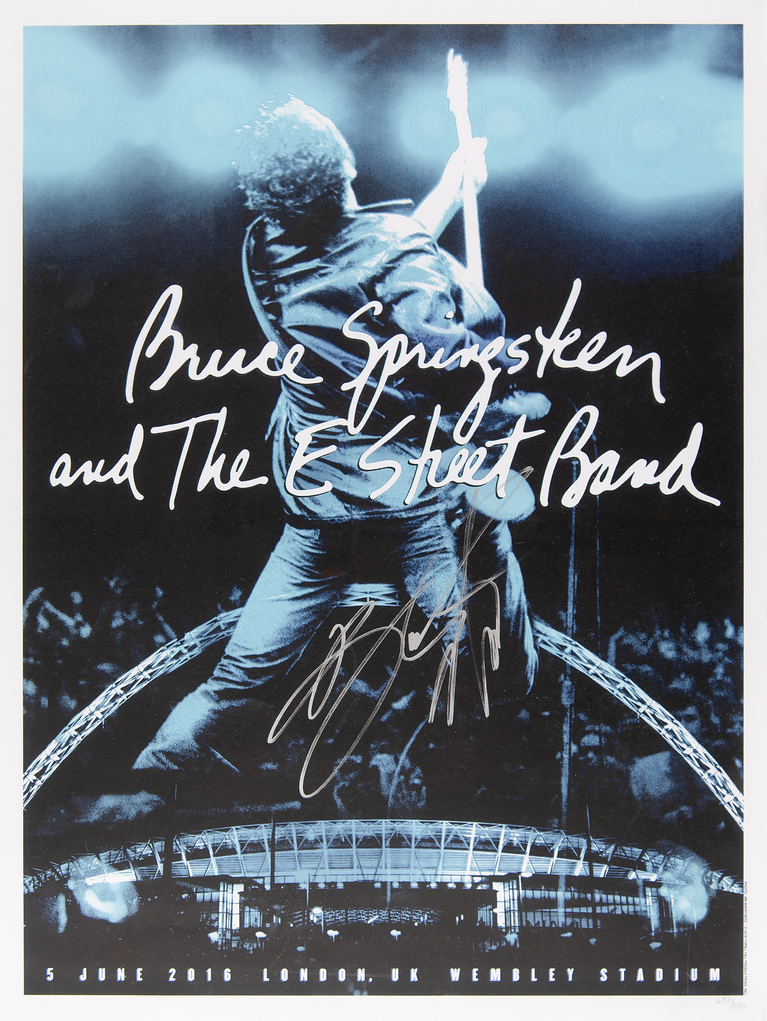 Attractive limited edition color 18 x 24 print released for Bruce Springsteen and the E Street Band’s historic concert at London’s Wembley Stadium on June 5, 2016, numbered 452/550, featuring a wonderful Jim Marchese image of Springsteen on stage with his guitar, signed prominently in silver ink by Springsteen. Rolled and in fine condition, with some unobtrusive light creasing to the top.