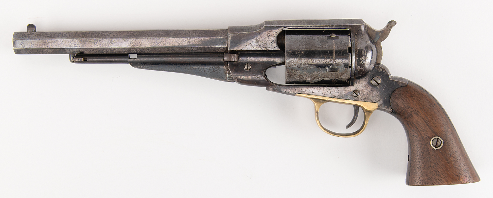 Remington 1858 New Model Army Revolver, .44 caliber, altered to cartridge (originally percussion), stamped on the frame: "C.A. 194." The gun appears to have been refinished, and exhibits some pitting to the metal. This is an antique firearm and transfers with no federal restriction.