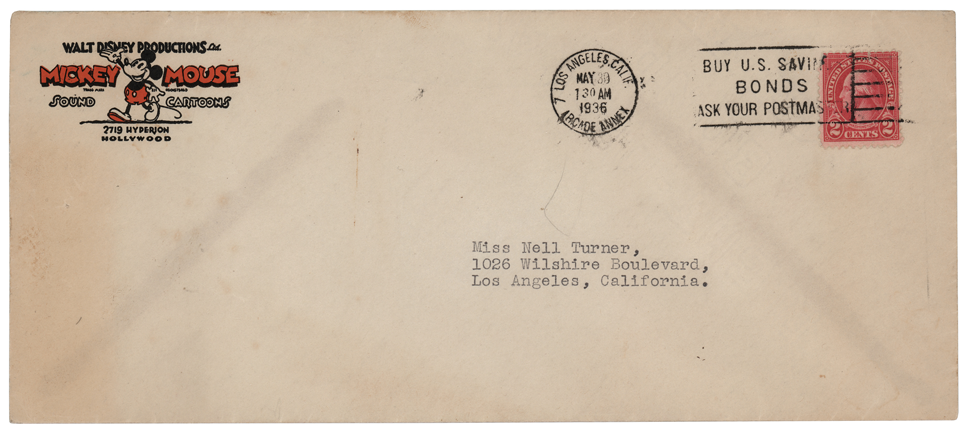 TLS signed “Roy,” one page, 8.5 x 11, illustrated Walt Disney Productions 'Mickey Mouse Sound Cartoons' letterhead, May 29, 1936. Letter to Nell Turner, in full: “I received a reply this morning from Dr. Giannini to my letter to him regarding the possibility of your securing employment with the Bank of America. He says, in part: ‘By all means, have Miss Turner call on me. I shall be glad to give her an interview and shall help her to secure a position, if it is in my power to do so.’ This fellow is a very straight shooter and means what he says, so I would suggest your calling his secretary, Miss Falcigha (pronounced Fal-see-ya) who you will find very gracious and helpful. The Doctor is easy to approach and a man who will give you every opportunity to ‘present yourself.’ Good luck, Nell. I am leaving for New York tonight and will be gone four weeks. When I return I will expect to hear that you are established some place in the Bank of America organization. You may present the enclosed letter to Doctor Giannini as a means of identification.” In fine condition. Accompanied by the original ‘Mickey Mouse’ mailing envelope.