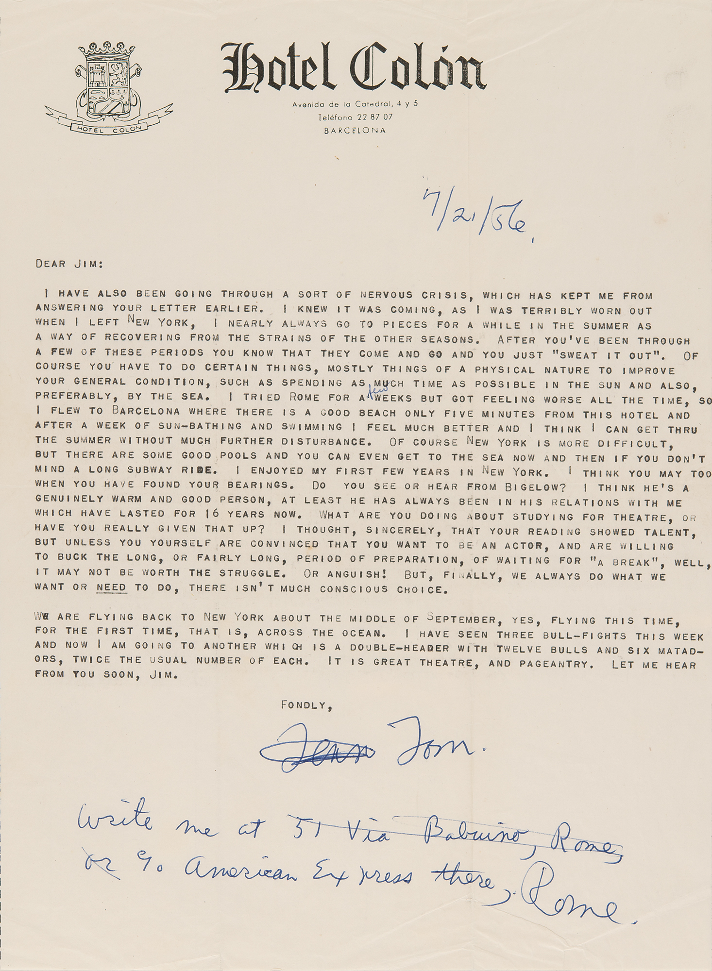 TLS signed "Tom" (with "Tenn" previously written and struck through), one onionskin page, 8 x 11, Hotel Colon letterhead, July 21, 1956. Letter to James Preston Adams, in part: "I have also been going through a sort of nervous crisis, which has kept me from answering your letter earlier. I knew it was coming, as I was terribly, worn out when I left New York, I nearly always go to pieces for a while in the summer as a way of recovering from the strains of the other seasons. After you've been through a few of these periods you know that they come and go and you just 'sweat it out.' Of course you have to do certain things, mostly things of a physical nature to improve your general condition, such as spending as much time as possible in the sun and also, preferably, by the sea. I tried Rome for a few weeks but got feeling worse all the time, so I flew to Barcelona where there is a good beach only five minutes from this hotel and after a week of sun-bathing and swimming I feel much better and I think I can get thru the summer without much further disturbance. Of course New York is more difficult but there are some good pools and you can even get to the sea now and then if you don't mind a long subway ride. I enjoyed my first few years in New York. I think you may too when you have found your bearings. Do you see or hear from Bigelow? I think he's a genuinely warm and good person, at least he has always been in his relations with me which have lasted for 16 years now. What are you doing about studying for theatre, or have you really given that up? I thought, sincerely, that your reading showed talent, but unless you yourself are convinced that you want to be an actor, and are willing to buck the long, or fairly long, period of preparation, of waiting for 'a break,' well, it may not be worth the struggle. Or anguish! But, finally, we always do what we want or need to do, there isn't much conscious choice.