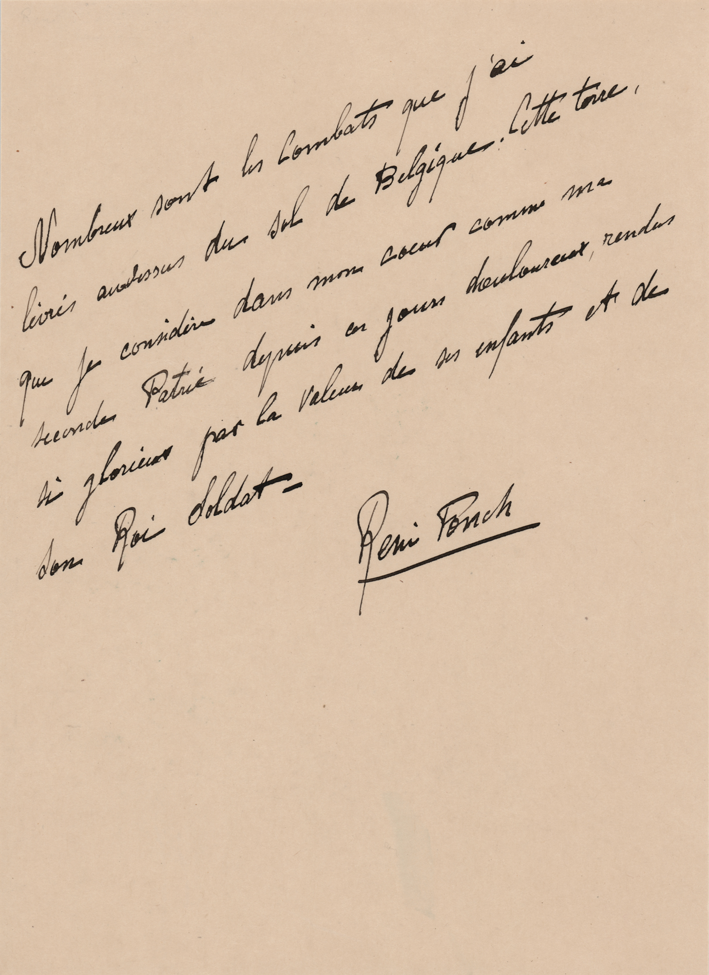 French aviator who ended WWI as the top Allied fighter ace (1894–1953). AMS in French from Rene Fonck, handwritten in ink on an off-white 6.5 x 9 sheet, no date, signed at the conclusion, “Rene Fonck.” The handwritten passage reads (loosely translated): “Many are the battles that I have fought over the soil of Belgium. This land, which I consider in my heart as my second homeland, has been made so glorious in happy days by the valor of its children and its Soldier King.” In very fine condition. Accompanied by a period pearl-finish 6.75 x 4.75 photo of Fonck accepting a cigarette from fellow fighter ace and former enemy Ernst Udet, the highest-scoring German fighter pilot to survive World War I and the second-highest scoring ace after Manfred von Richthofen, the Red Baron, his commander in the Flying Circus. A desirable format from Fonck, who remains rare across all handwritten formats.