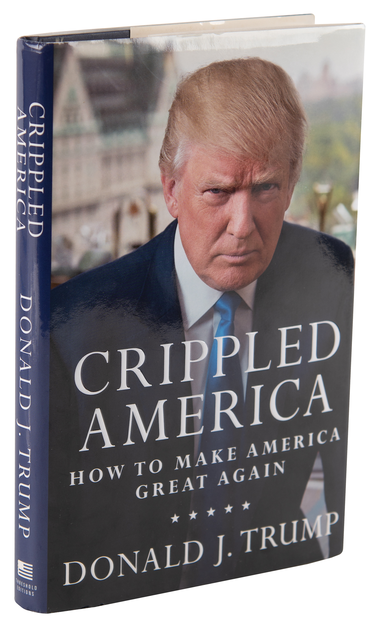 Signed book: Crippled America. Limited first edition, numbered 184/10000. NY: Threshold Editions, 2015. Hardcover with dust jacket, 5.75 x 8.75, 193 pages. Signed on the numbered bookplate affixed to an opening page in black felt tip by Donald Trump. In fine condition. Accompanied by a full letter of authenticity from PSA.