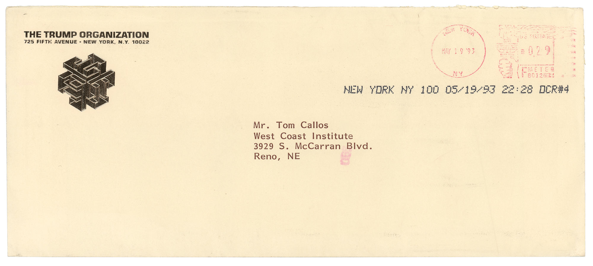 TLS, one page, 8.5 x 11, The Trump Organization letterhead, May 19, 1993. Letter to Tom Callos of the West Coast Institute, offering some life advice. In part: "I believe that hard work and perseverance is the way to the top. At this point in your lives take the opportunity to further your education and learn as much as you possibly can. This will enable you to have the chance to do whatever you put your minds to." In fine condition. Accompanied by the original mailing envelope.