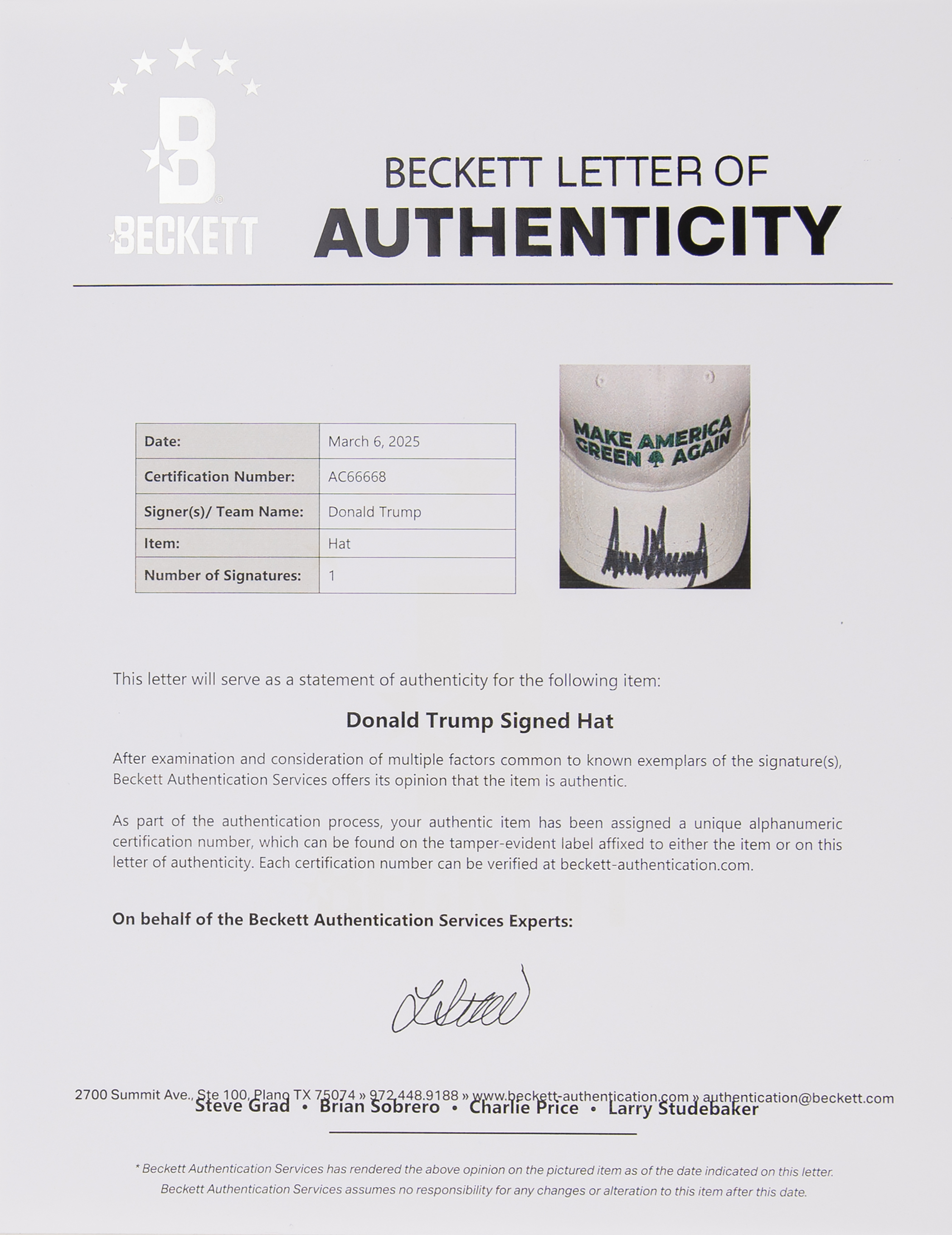 White adjustable baseball cap by Cali-Fame Headwear embroidered in green, "Make America Green Again," signed on the bill in black felt tip by Donald Trump. In fine condition, with a Beckett authentication hologram affixed under the bill and accompanied by a full letter of authenticity from Beckett Authentication Services.