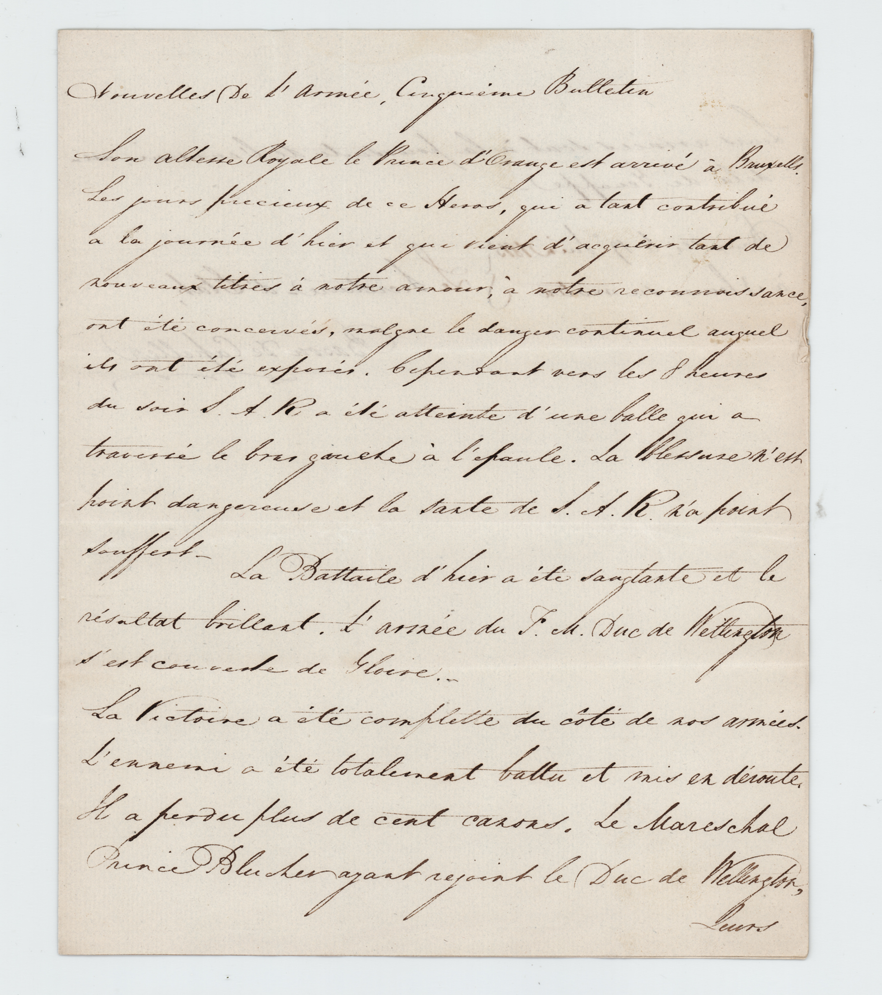 Mere hours after the Battle of Waterloo—"The army of the Duke of Wellington obtained a glorious victory. It has been a complete and full victory for our armies. The enemy has been completely defeated and routed back"
