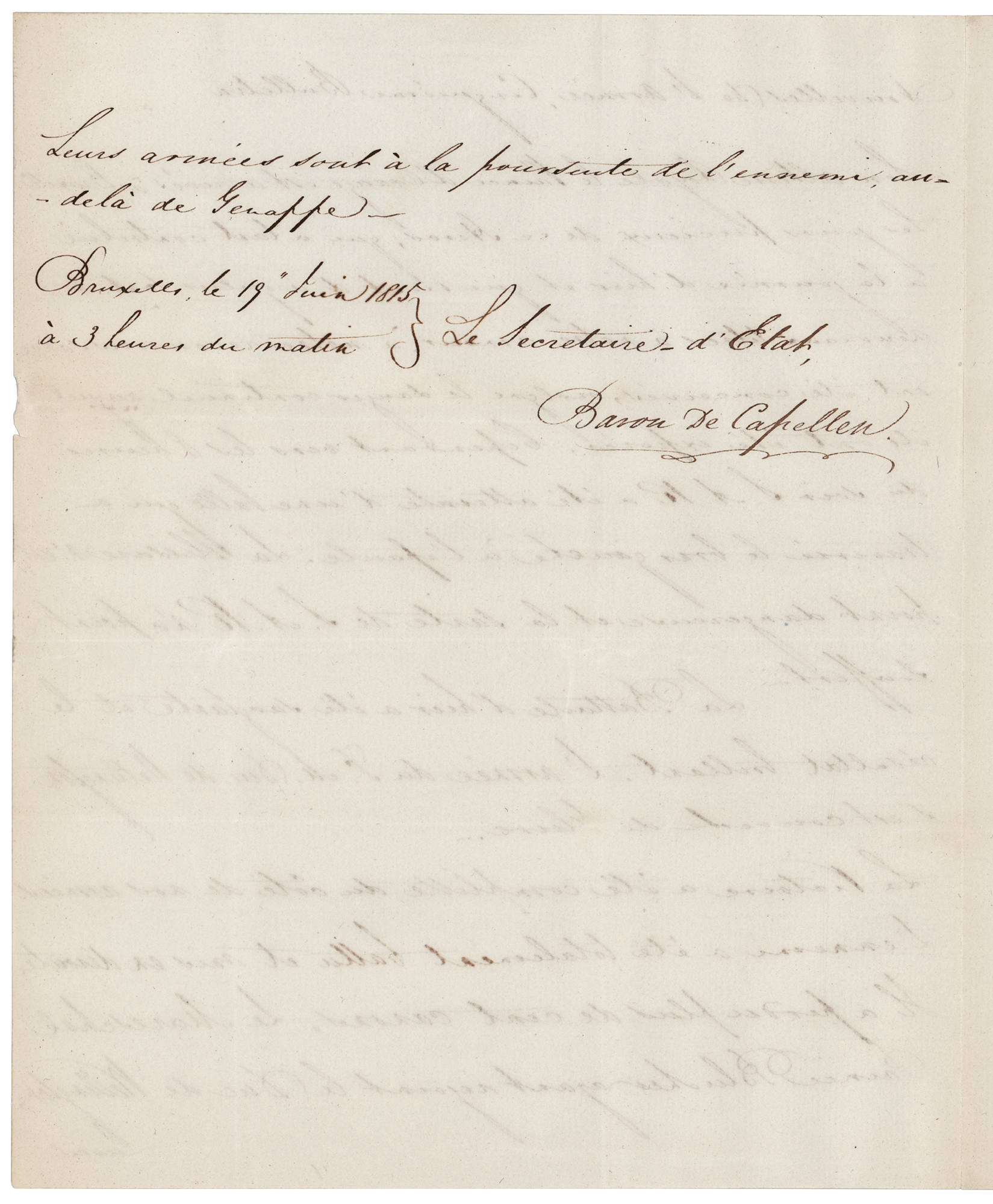 Dutch statesman (1778-1848) who held several important posts under the Kingdom of Holland and the Sovereign Principality of the United Netherlands, before he was appointed as one of the Commissioners-General of the Dutch East Indies. Fascinating ALS in French, signed “Baron de Capellen,” one page both sides, 7.5 x 9, June 19, 1815, at three o´clock in the morning, only hours after the Battle of Waterloo took place. Addressed from Brussels, a handwritten letter from Godert van der Capellen as the Secretary of State, reflecting on the historic events of the day prior, in part (translated): “His Royal Highness the Prince of Orange has arrived to Brussels…Nevertheless towards 8h in the evening, H.R.H was wounded by a bullet which went through his left arm near the shoulder. The wound is not dangerous and the health of H.R.H has not suffered. The battle yesterday was sanguinary and the result brilliant. The army of the Duke of Wellington obtained a glorious victory. It has been a complete and full victory for our armies. The enemy has been completely defeated and routed back. They have lost over one hundred cannons. Marshal Prince Blucher having joined the Duke of Wellington, their armies are pursuing the enemy beyond Genappe.” In fine condition.