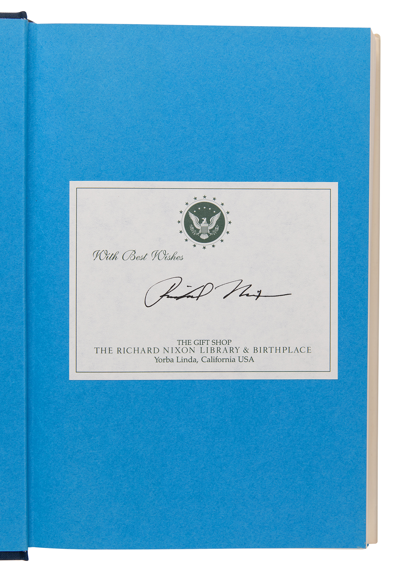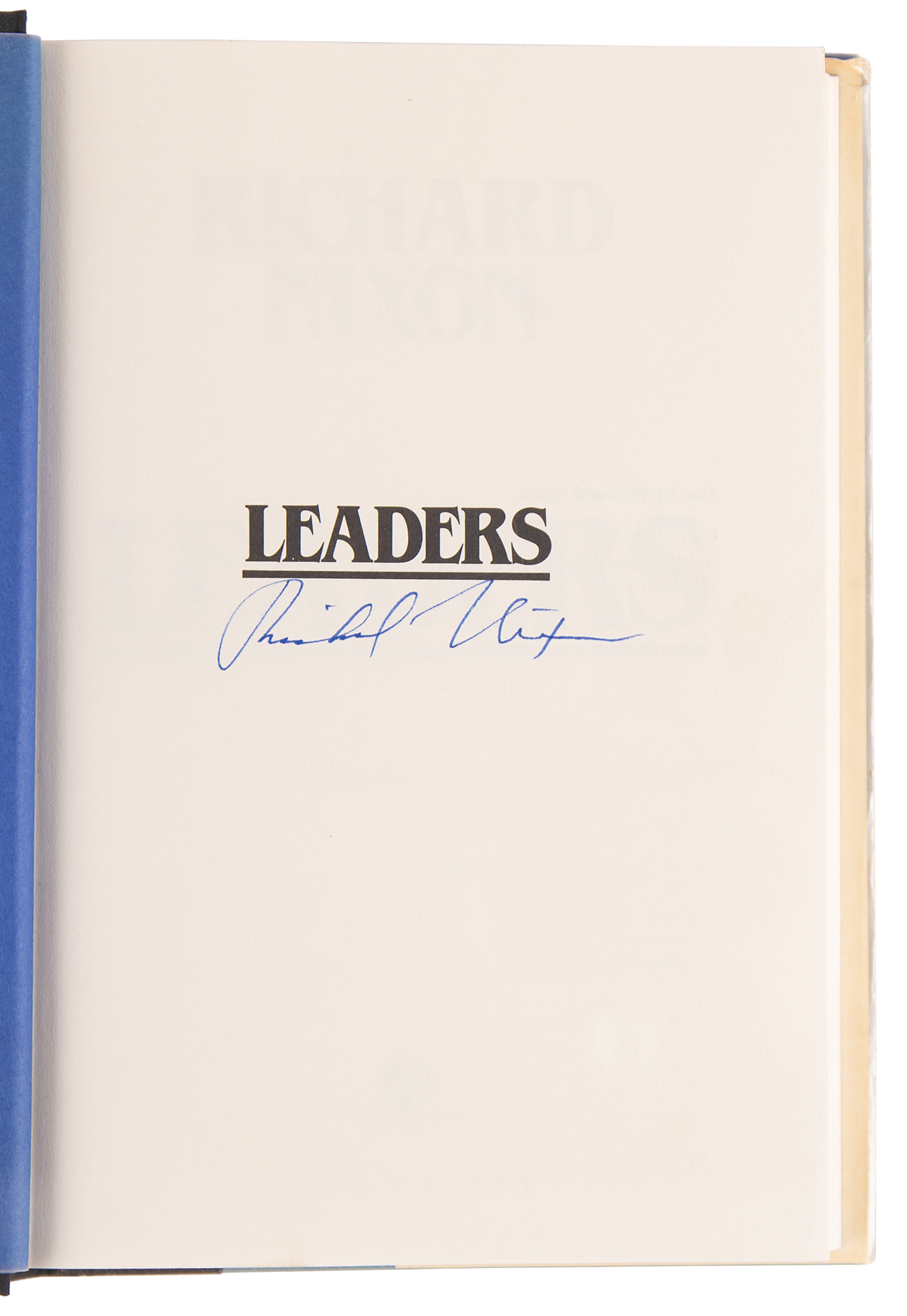 Signed book: Leaders. First edition. NY: Warner Books, 1982. Hardcover with dust jacket, 6.25 x 9.25, 371 pages. Signed on the half-title page in blue felt tip by Richard Nixon. In very good to fine condition, with foxing to the top edge of the textblock and edgewear to the dust jacket.