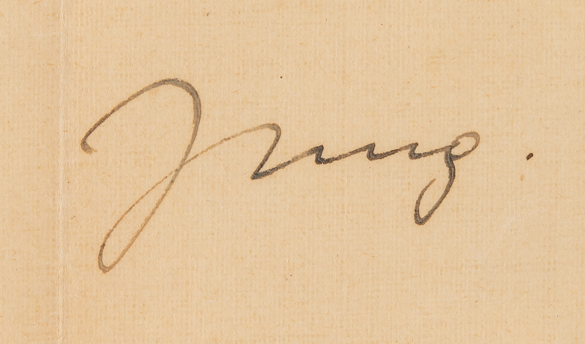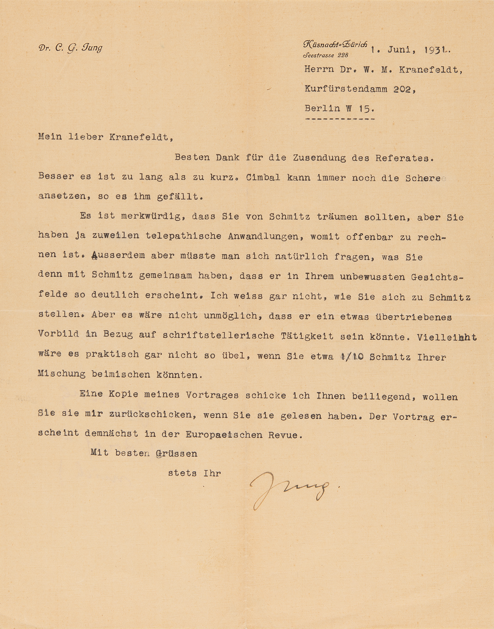 TLS signed “Jung,” one page, 8.25 x 10.5, personal letterhead, June 1, 1931. Letter to his colleague, Dr. Wolfgang M. Kranefeldt, in full (translated): “Many thanks for sending the references. It’s better it should be too long than too short. Cimbal can still use the scissors as he pleases. It is strange that you should dream of Schmitz [likely the German writer Oskar A. H. Schmitz], but you sometimes have telepathic attacks, which is obviously to be expected. In addition, however, one naturally had to ask oneself what you have in common with Schmitz that makes him appear so clearly in your unconscious field of vision. I don't even know how you feel about Schmitz. But it would not be impossible that he could be a somewhat exaggerated example in terms of writing. Maybe it wouldn't be so bad in practice if you could add about 1/10th Schmitz to your mix. I am enclosing a copy of my lecture, if you want to send it back to me when you have read it. The lecture will appear soon in the European Review.” In fine condition.