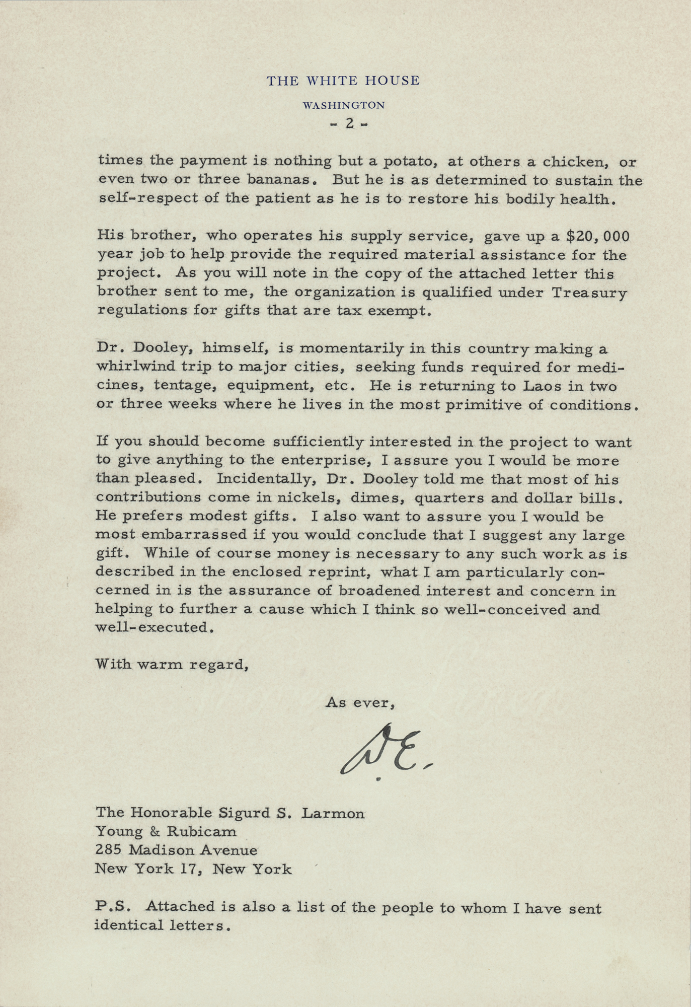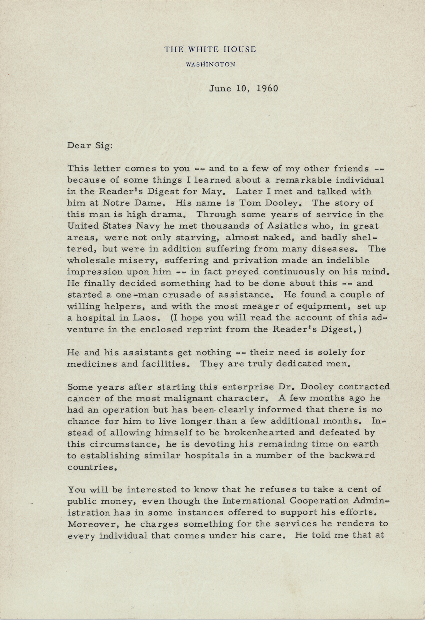 TLS as president signed “D. E.,” one page, 6.75 x 9, White House letterhead, September 12, 1960. Letter to Sigurd S. Larmon, chairman of the global advertising and marketing agency Young & Rubicam, in full: “This letter comes to you — and to a few of my other friends — because of some things I learned about a remarkable individual in the Reader's Digest for May. Later I met and talked with him at Notre Dame. His name is Tom Dooley. The story of this man is high drama. Through some years of service in the United States Navy he met thousands of Asiatics who, in great areas, were not only starving, almost naked, and badly sheltered, but were in addition suffering from many diseases. The wholesale misery, suffering and privation made an indelible impression upon him — in fact preyed continuously on his mind. He finally decided something had to be done about this — and started a one-man crusade of assistance. He found a couple of willing helpers, and with the most meager of equipment, set up a hospital in Laos. (I hope you will read the account of this adventure in the enclosed reprint from the Reader's Digest.)