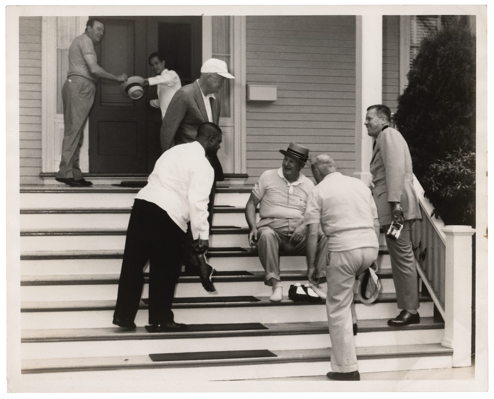 If you should become sufficiently interested in the project to want to give anything to the enterprise, I assure you I would be more than pleased. Incidentally, Dr. Dooley told me that most of his contributions come in nickels, dimes, quarters and dollar bills. He prefers modest gifts. I also want to assure you I would be most embarrassed if you would conclude that I suggest any large gift. While of course money is necessary to any such work as is described in the enclosed reprint, what I am particularly concerned in is the assurance of broadened interest and concern in helping to further a cause which I think so well-conceived and well-executed.” In fine condition. Accompanied by a vintage color glossy photo of Eisenhower with several gentlemen on a porch, one of whom is Larmon.