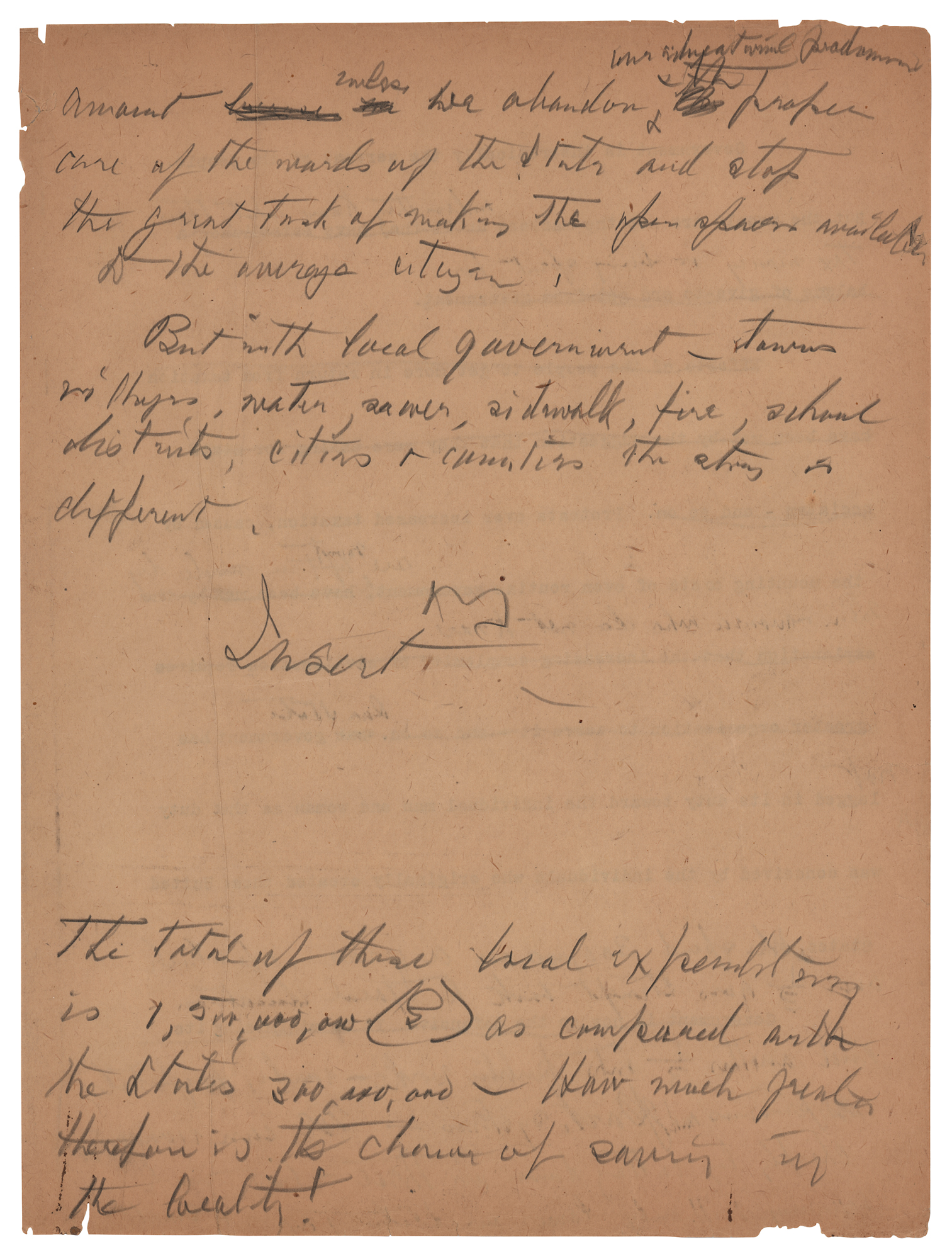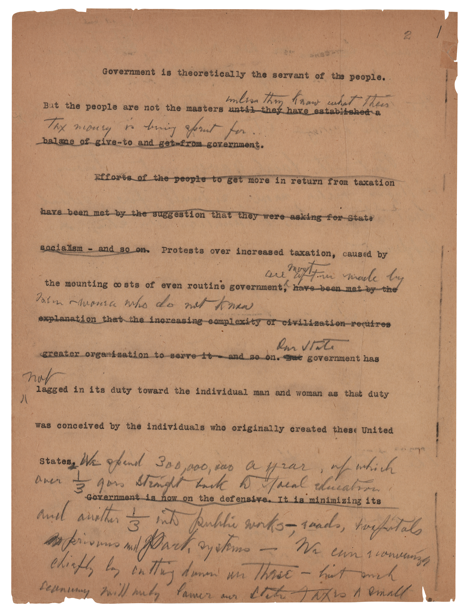 Uncommon hand-annotated typed and autograph manuscript draft by Franklin D. Roosevelt, unsigned, one page both sides, 8.25 x 11, no date but presumably circa 1928–1932, drafted when he was either running for governor of New York or while holding that office. The front is typed, with extensive corrections made in pencil by Roosevelt, beginning: "Government is theoretically the servant of the people. But the people are not the masters unless they know what their tax money is being spent for…Our state government has not lagged in its duty toward the individual man and woman as that duty was conceived by the individuals who originally created these United States."