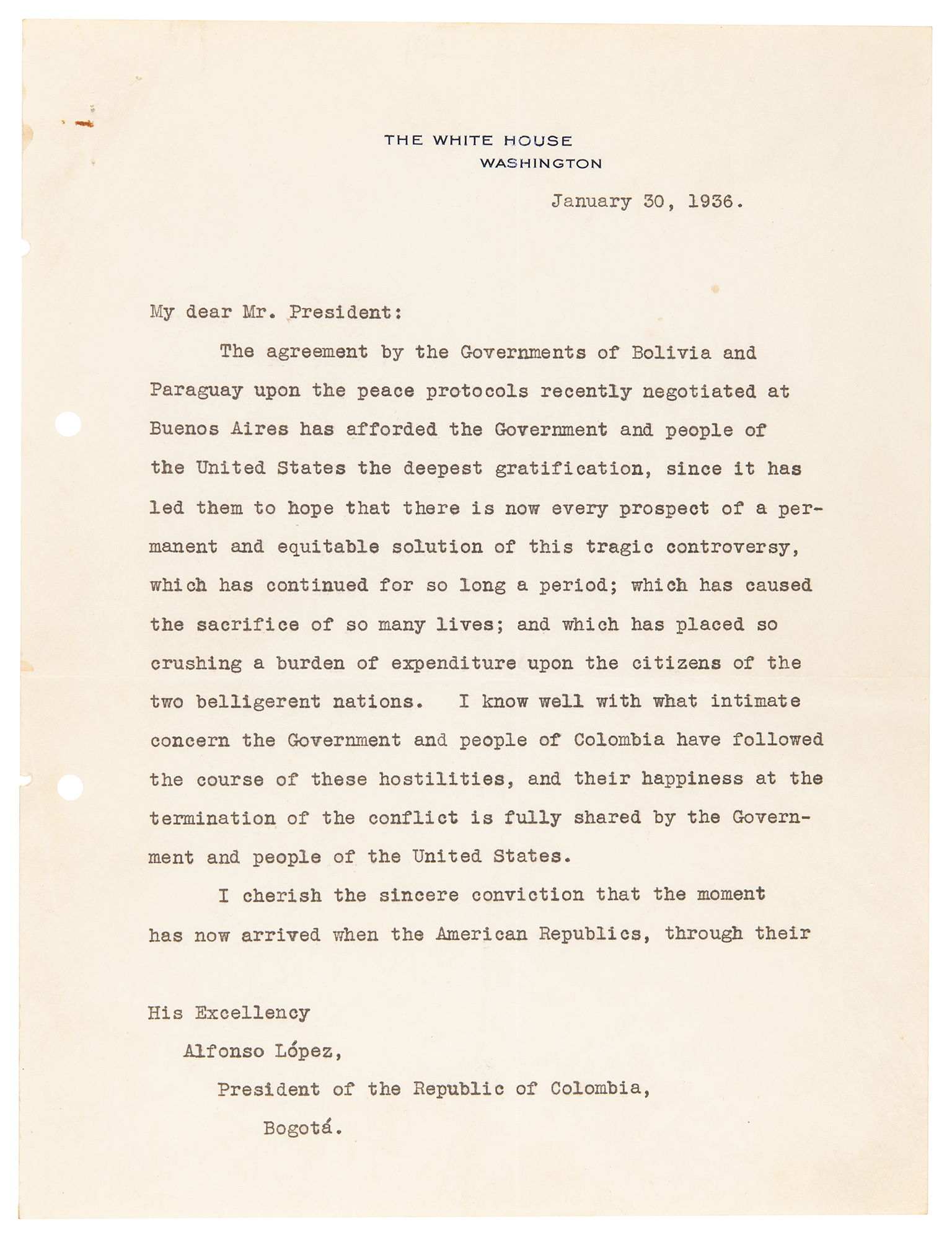 TLS as president, four pages, 8 x 10.5, White House letterhead, January 31, 1936. Letter to "His Excellency Alfonso Lopez, President of the Republic of Colombia," showcasing FDR's 'Good Neighbor' policy toward Latin America in action. Roosevelt sent copies of this letter to all Latin American heads of state, beginning with a reference to the recent end of the Bolivian-Paraguayan war over the Gran Chaco region. Roosevelt had declared an embargo on arms to both sides of the war in 1934, and the United States participated in the League of Nations commission which finally ended the war and brought an armistice in June 1935, followed by the exchange of peace protocols.
