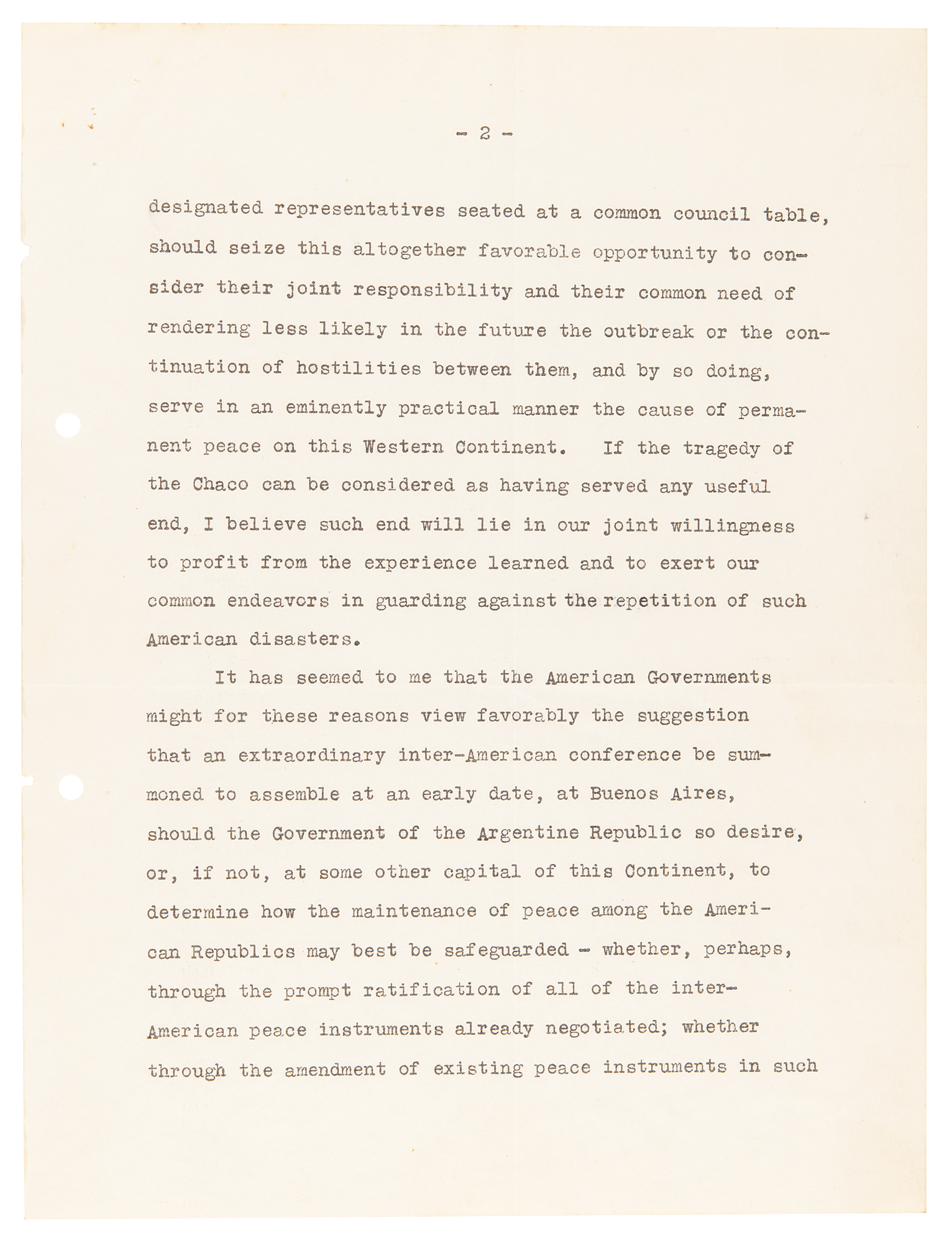 It has seemed to me that the American Governments might for these reasons view favorably the suggestion that an extraordinary inter-American conference be summoned to assemble at an early date, at Buenos Aires, should the Government of the Argentine Republic so desire, or, if not, at some other capital of this Continent, to determine how the maintenance of peace among the American Republics may best be safeguarded whether, perhaps, through the prompt ratification of all of the inter-American peace instruments already negotiated; whether through the amendment of existing peace instruments in such manner as experience has demonstrated to be most necessary; or perhaps through the creation by common accord of new instruments of peace additional to those already formulated.
