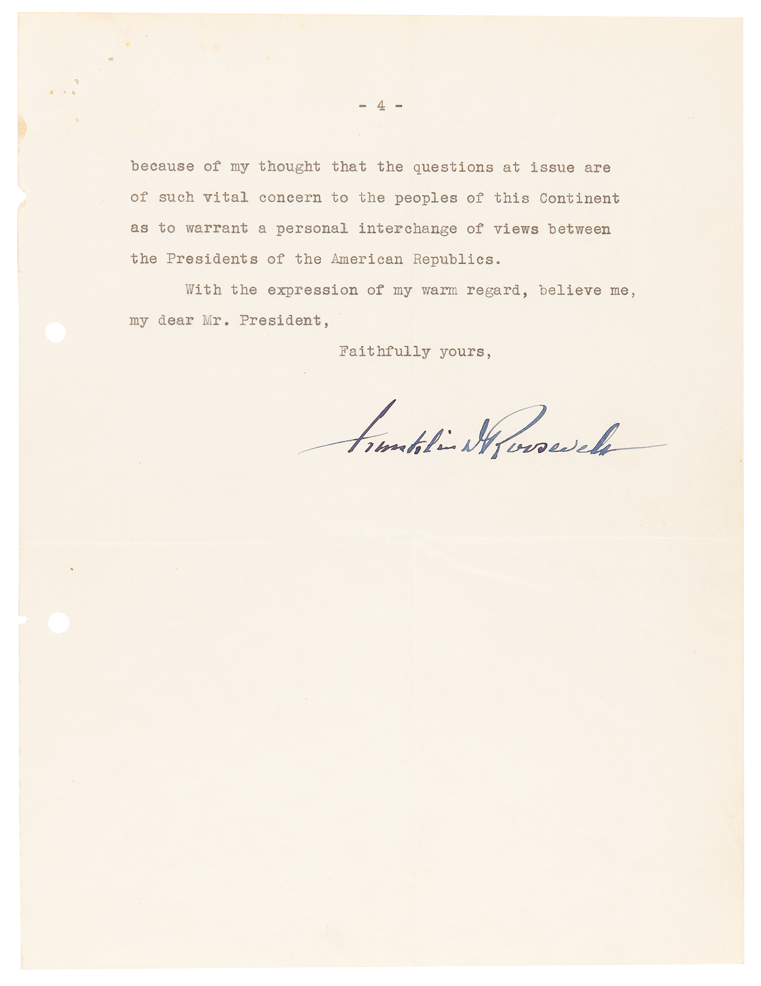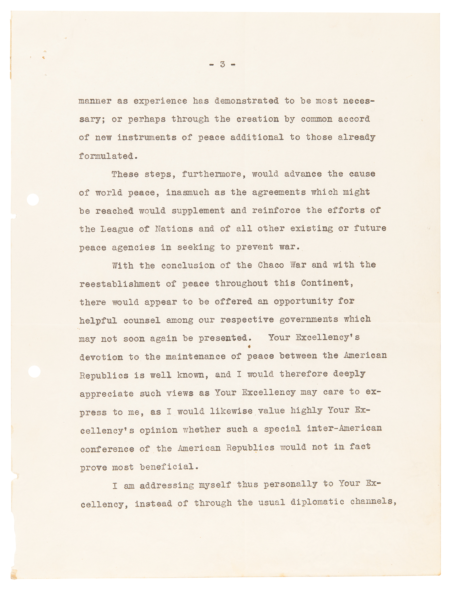I am addressing myself thus personally to Your Excellency, instead of through the usual diplomatic channels, because of my thought that the questions at issue are of such vital concern to the peoples of this Continent as to warrant a personal interchange of views between the Presidents of the American Republics." In fine condition, with marginal staple and file holes.