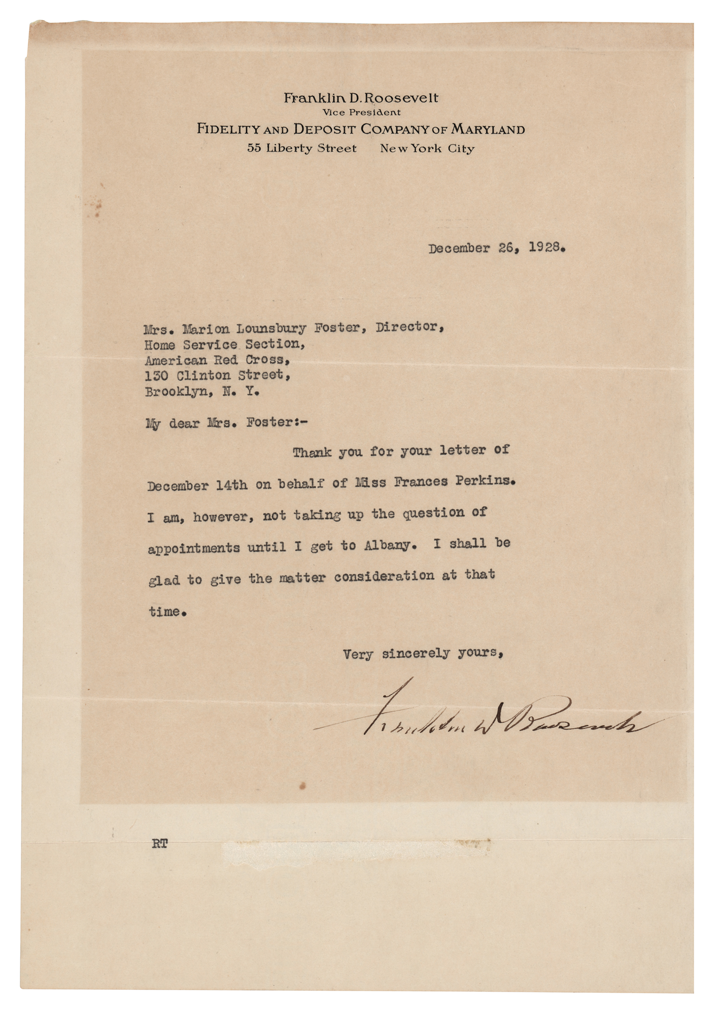 TLS, one page, 7.25 x 10.5, Fidelity and Deposit Company of Maryland letterhead, December 26, 1928. Letter to Marion Lounsbury Foster, a director of the American Red Cross, in part: "Thank you for your letter of December 14th on behalf of Miss Frances Perkins. I am, however, not taking up the question of appointments until I get to Albany. I shall be glad to give the matter consideration at that time." In very good to fine condition, with toning from prior display.