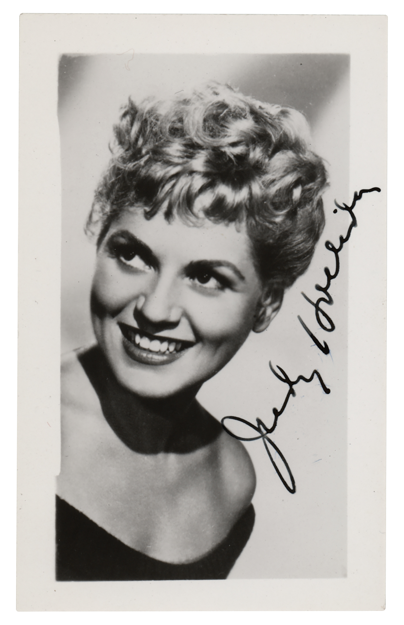 Vintage glossy 2.5 x 4 photo of Judy Holliday smiling broadly, nicely signed in fountain pen. In fine condition.