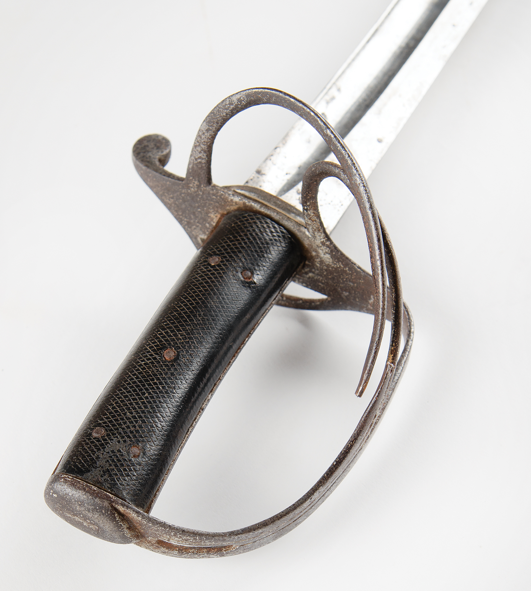 Confederate cavalry saber imported from Great Britain, marked on the ricasso: "Parker Field & Sons, 233 Holborn, London," with a small decorative etching. The sword measures 41˝ long overall, with a 35.5˝ slightly curved, single-edged blade. Exhibits overall tarnishing and patina, with one band of the guard neatly snapped.