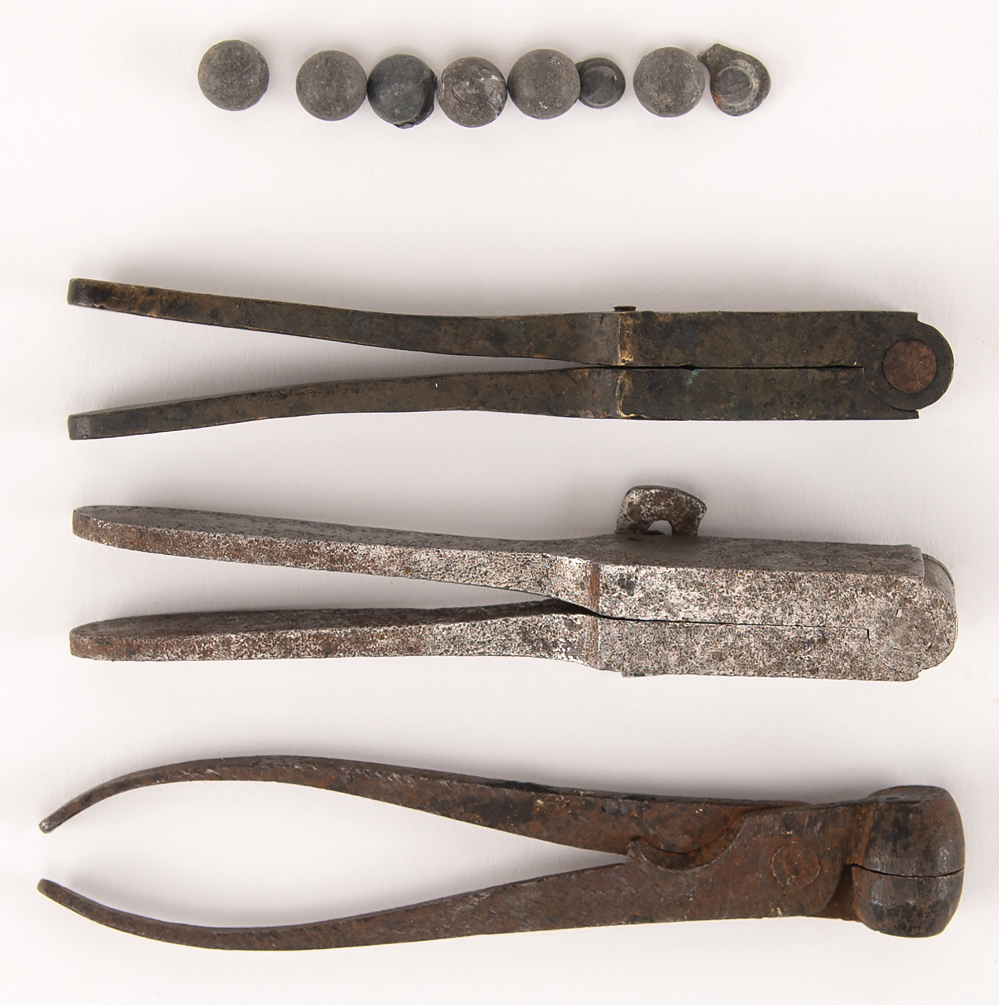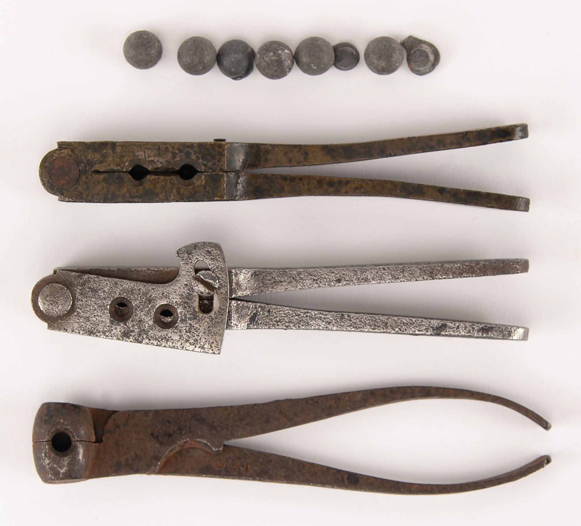 Three different Civil War-era bullet molds, each measuring about 5˝ long. Includes: a .36 caliber round ball bullet mold, marked "100" (representing 100 balls per pound of lead), with several examples of formed lead shot; a double bullet mold marked with Colt's patent; and a double bullet mold with sprue cutter and Colt marking. In overall very good condition.
