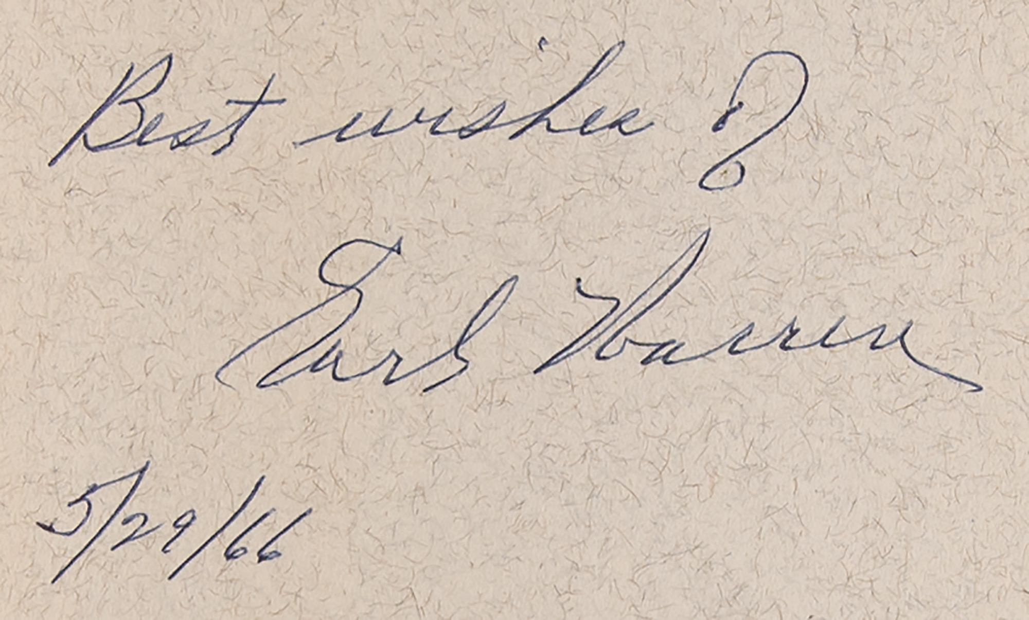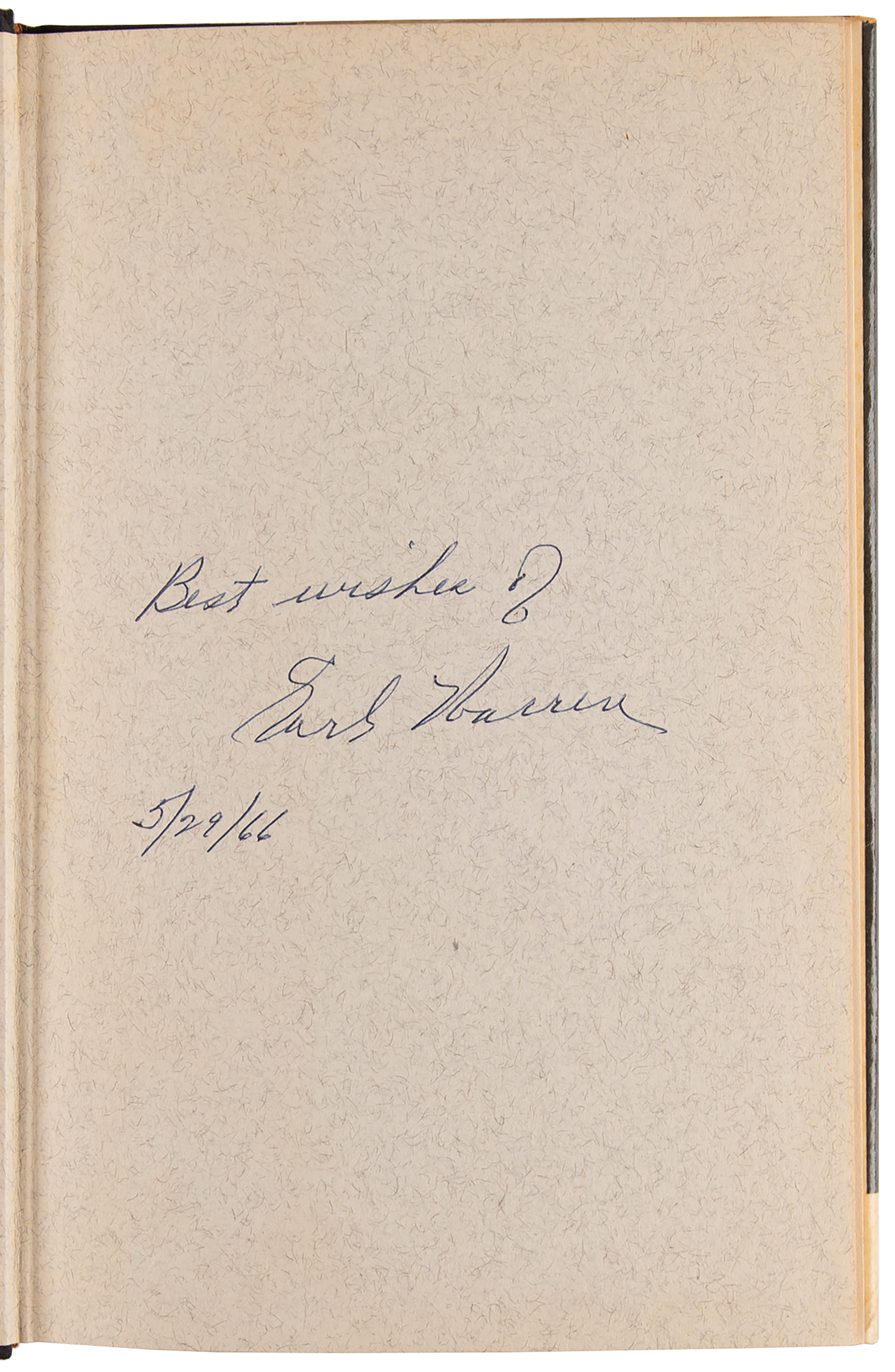 Signed book: The Public Papers of Chief Justice Earl Warren. First edition. NY: Simon and Schuster, 1959. Hardcover with dust jacket, 6 x 9.25, 237 pages. Signed on the first free end page in blue ballpoint, "Best wishes of Earl Warren, 5/29/66." In fine condition, with a price-clipped dust jacket.
