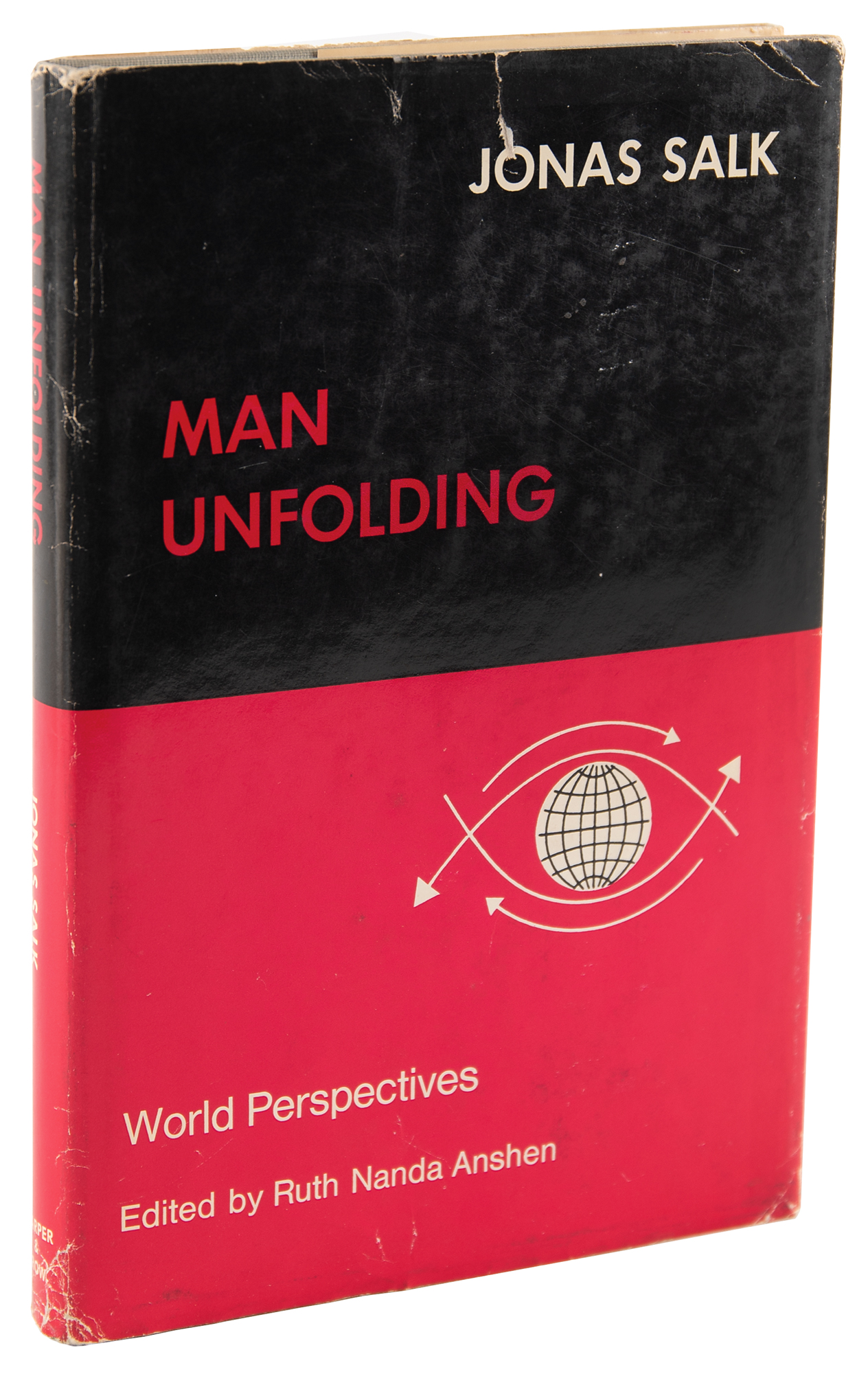 Signed book: Man Unfolding. Later printing. NY: Harper & Row, 1972. Hardcover with dust jacket, 5.75 x 8.5, 118 pages. Signed on the first free end page in black felt tip by Jonas Salk. In fine condition, with some light wear, and a short edge tear, to the dust jacket.