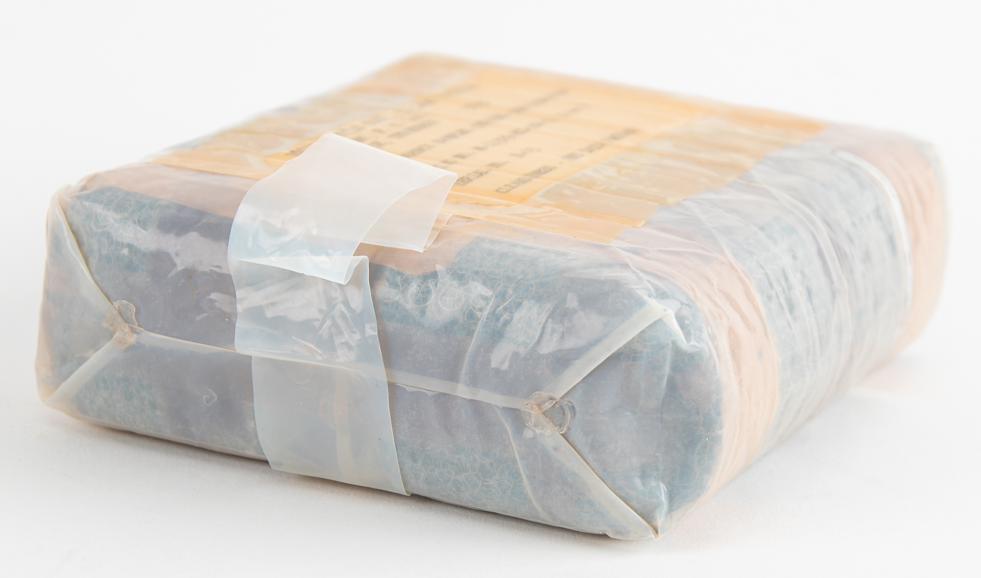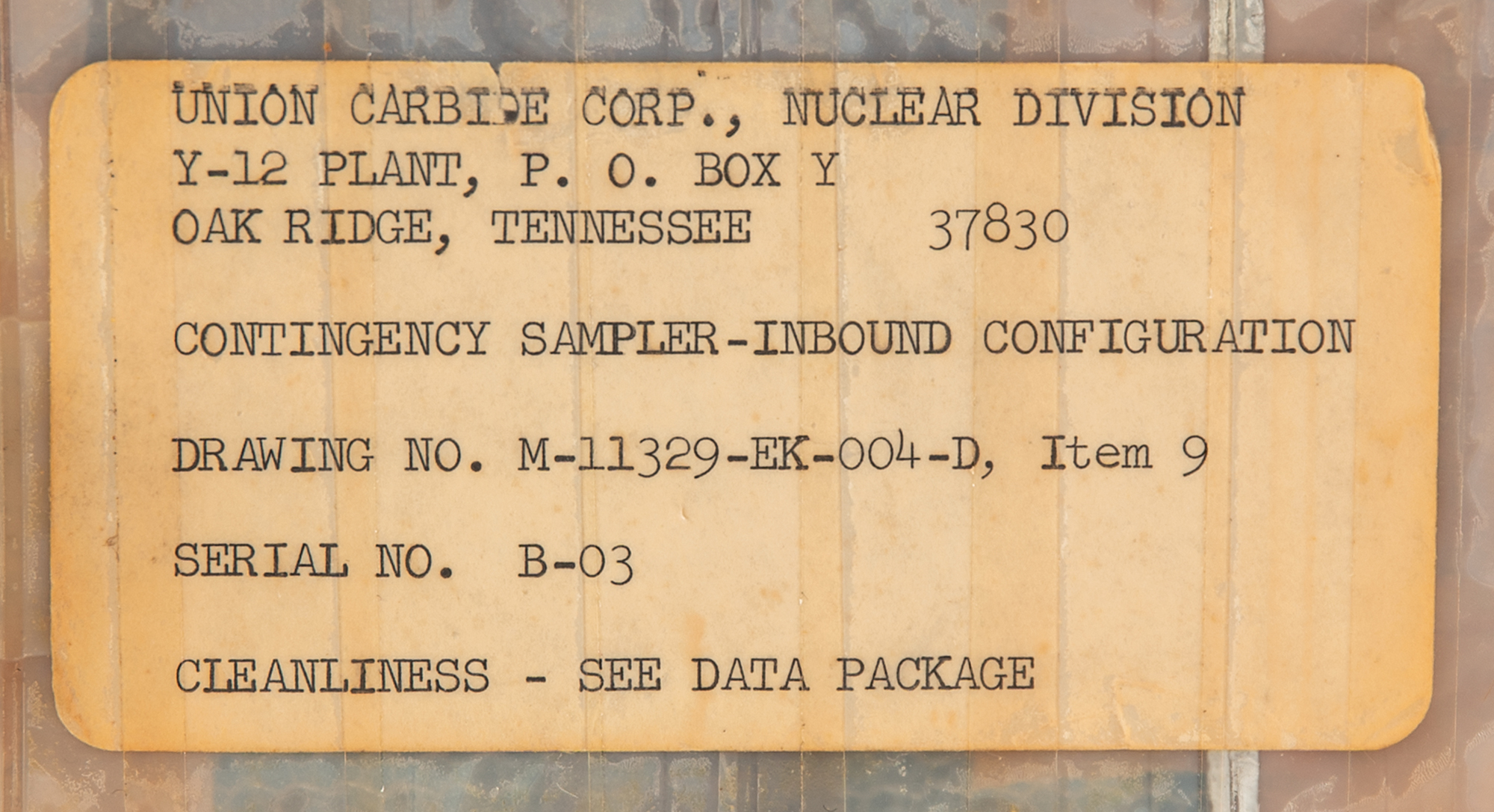 Still-sealed Apollo Contingency Soil Sampler by Union Carbide, measuring 6˝ x 5˝ x 1.75˝ in its original packaging, labeled: "Union Carbide Corp., Nuclear Division, Y-12 Plant…Oak Ridge, Tennesseee…Contingency Sampler-Inbound Configuration, Drawing No. M-11329-EK-004-D, Item 9, Serial No. B-03." In fine condition.