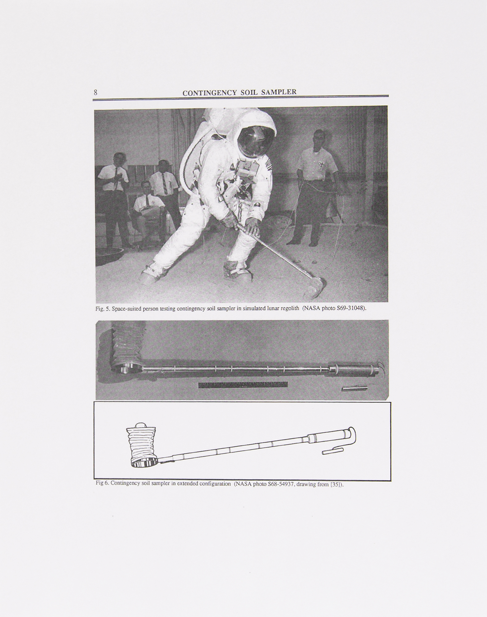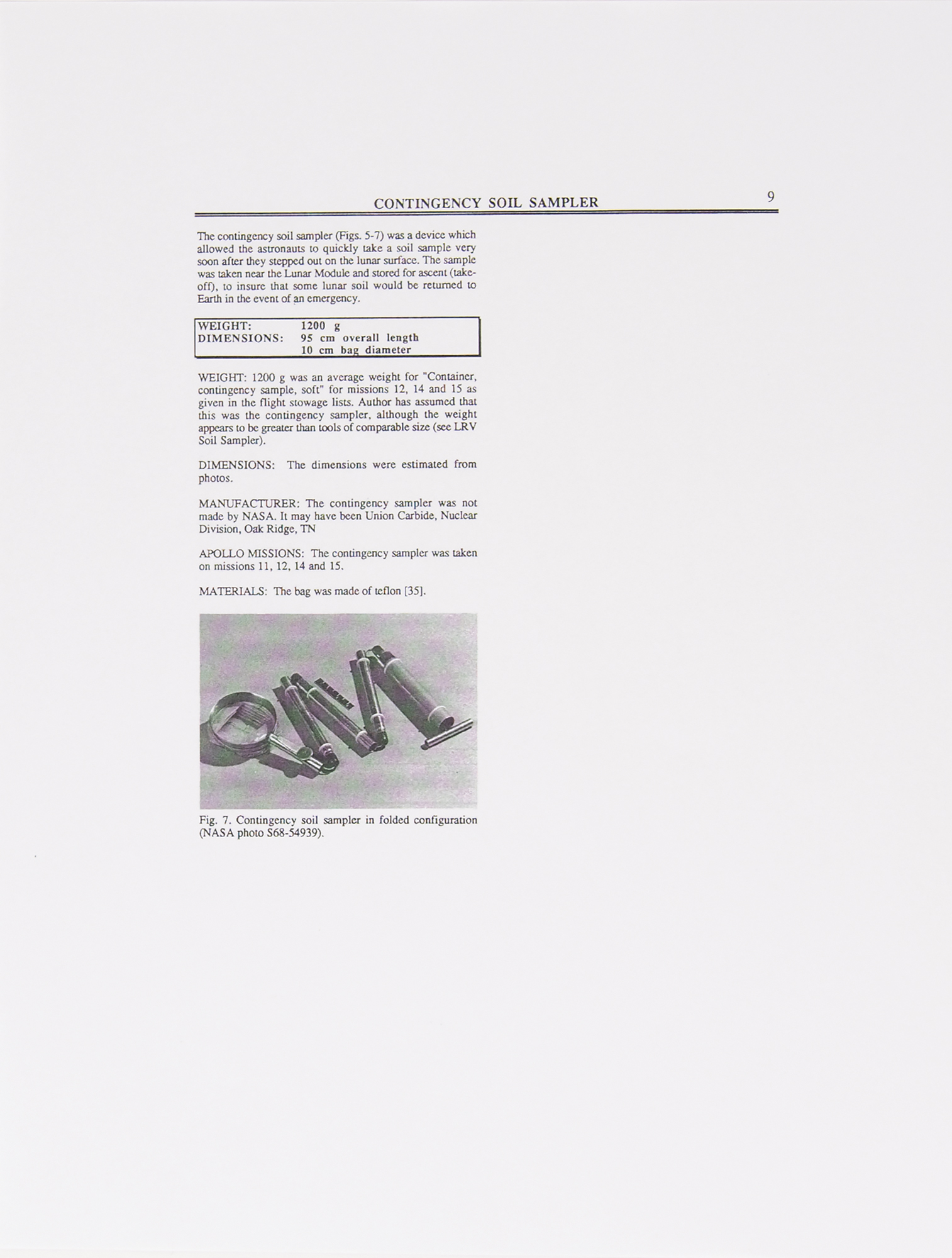The 'Contingency Soil Sampler'—essentially a teflon bag on a rigid ring at the end of an extendable, folding rod—was developed to allow astronauts to quickly collect a sample of lunar soil upon stepping onto the lunar surface. Taken in the immediate vicinity of the Lunar Module, the sample would be stored for ascent to ensure the return of a small amount of lunar material in the case of emergency. Contingency samplers were carried on Apollo 11, 12, 14, and 15.