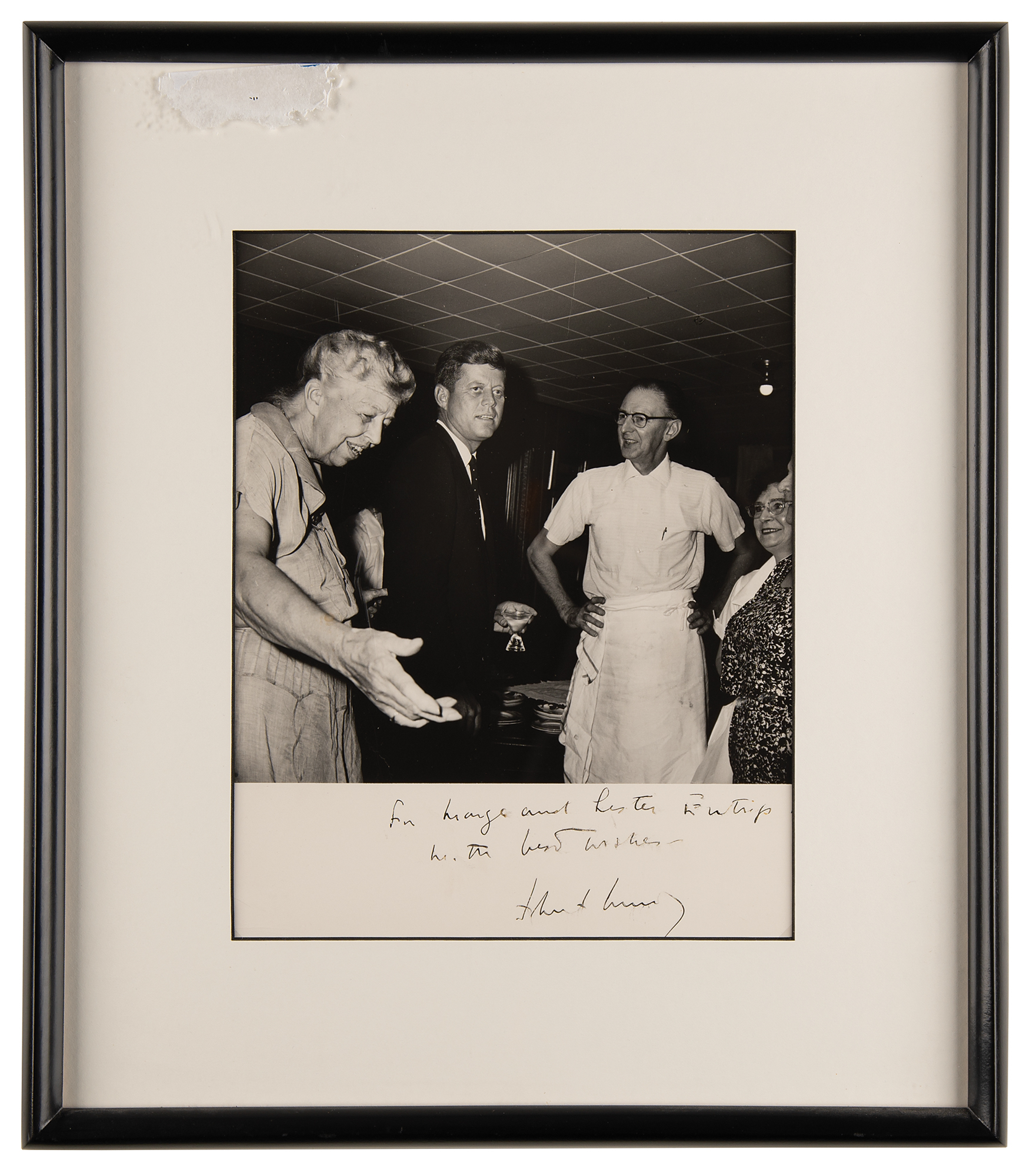 Desirable glossy 7.5 x 9.5 photo of John F. Kennedy visiting with Eleanor Roosevelt in an effort to earn her endorsement for his presidential candidacy, signed and inscribed in the lower border in fountain pen, "For Marge and Lester Entrup, with best wishes, John F. Kennedy.” Nicely matted and framed to an overall size of 13 x 15. In fine condition, with a few small creases and a bit of brushing to the autograph. Marge and Lester Entrup were household employees at Eleanor Roosevelt s home at Val-Kill, providing cooking and property maintenance services.