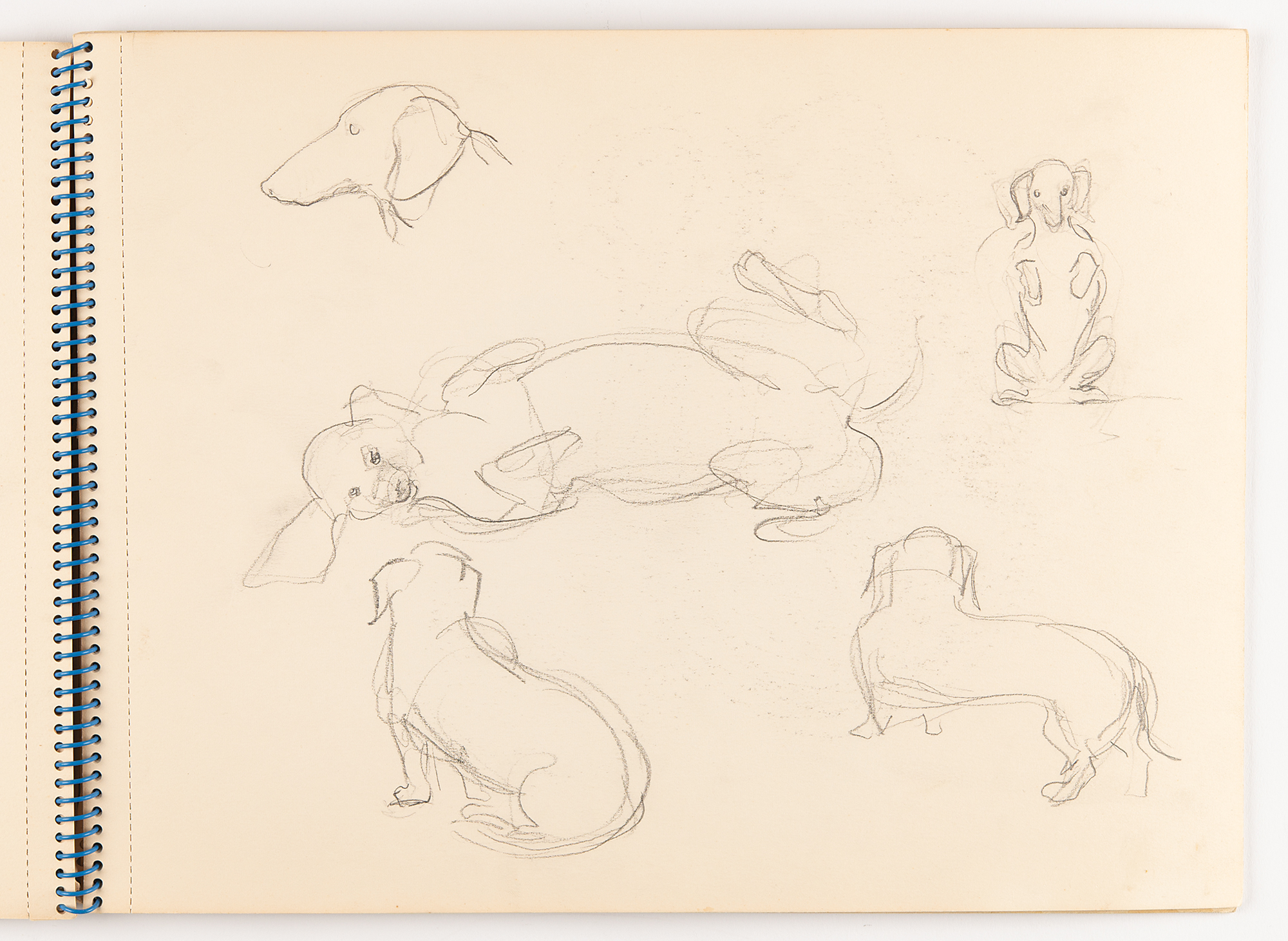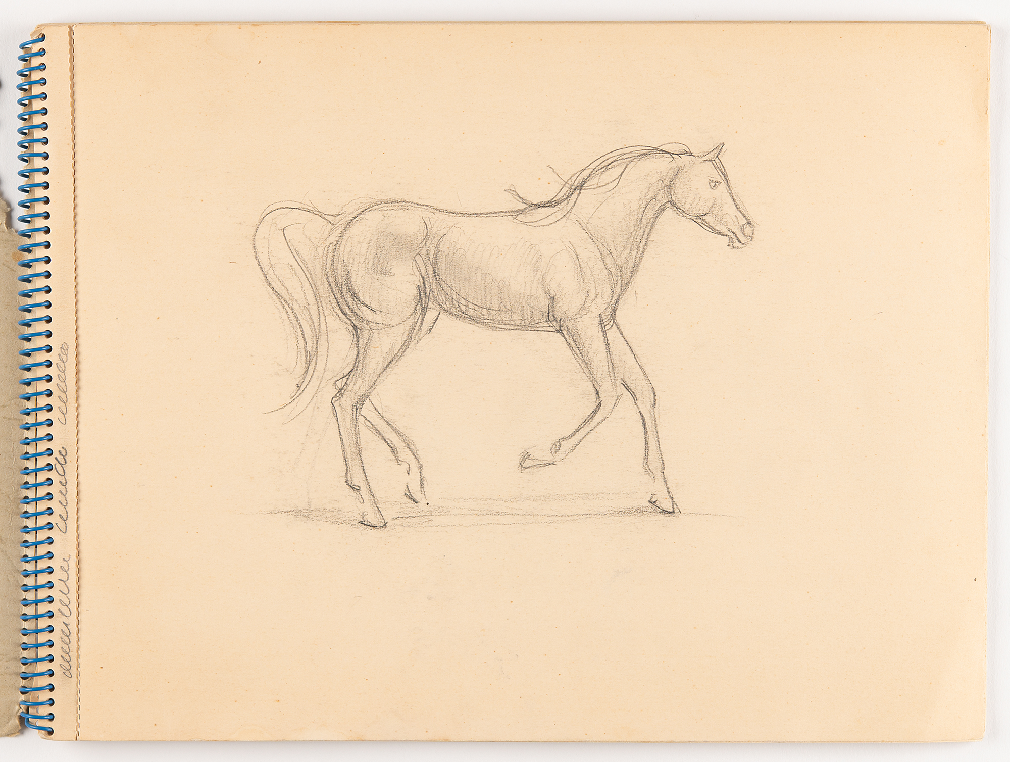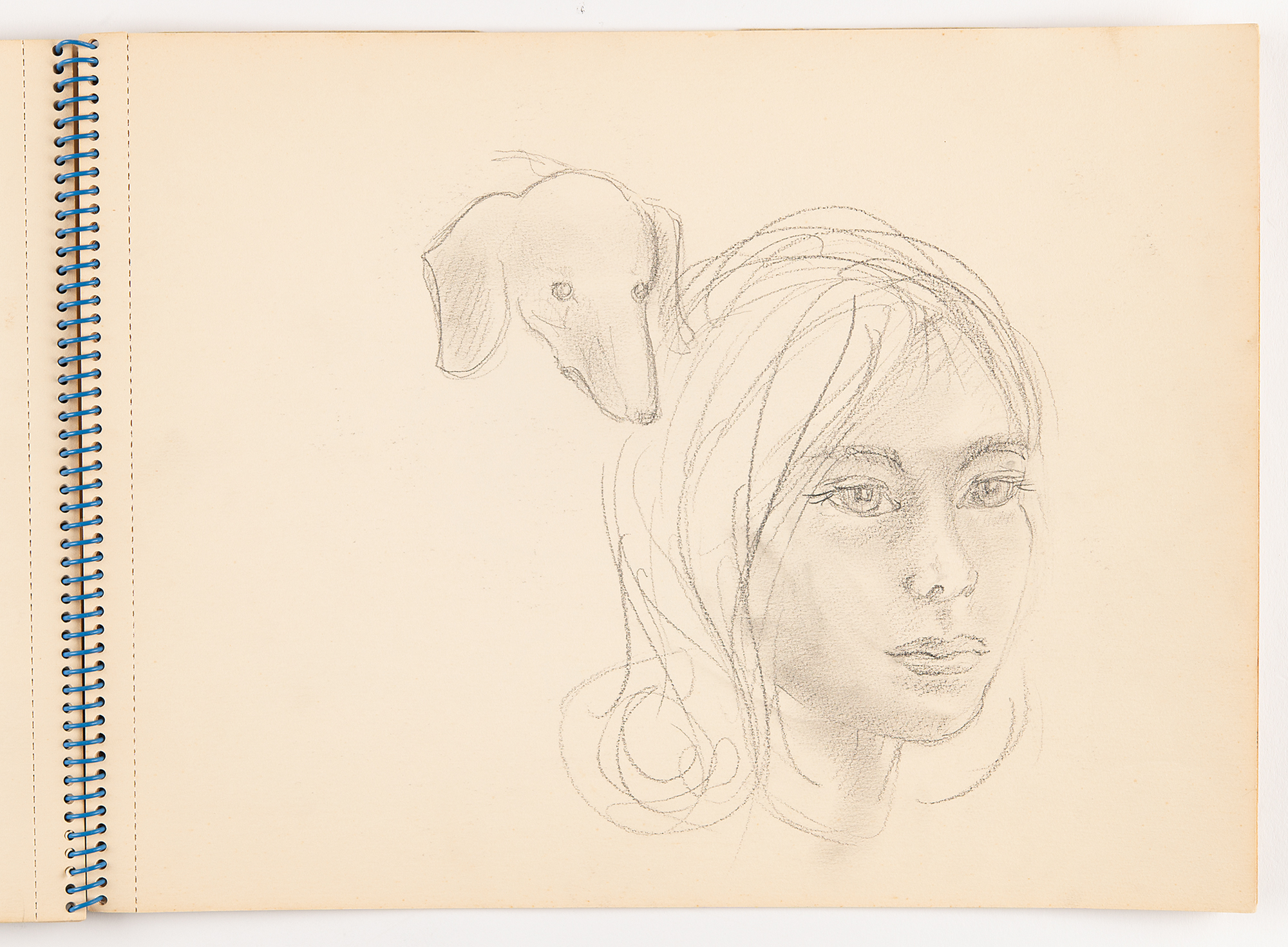 American actress, model, and socialite (1943–1971) known as one of Andy Warhol's superstars and muse to Bob Dylan. Edie Sedgwick's spiral-bound 12.75 x 9.5 'Studie Aquarel Bloc' sketch pad, containing eight original unsigned drawings in graphite (several back-to-back on a single leaf). Subjects are: a trotting horse, shown from the side; a trio of horse sketches, including a detailed, close-up portrait and two rough full-body sketches; a dove and a ballerina; five rough sketches of a small dog lying down; a detailed portrait of a girl and the dog; the same dog in five poses, rolling over and sitting up; a profile portrait of a young woman; and a rough side-view sketch of a horse. On one page, Sedgwick jots an address: "Lyden, 2 & 3 o'clock, Chopin St. No. 5, before Amsterdam, (020 712772)." On the front cover, she writes "beleive," "Budha," and "arose, arrose." In fine condition, with some damage only to the covers; interior pages are clean and unaffected.
