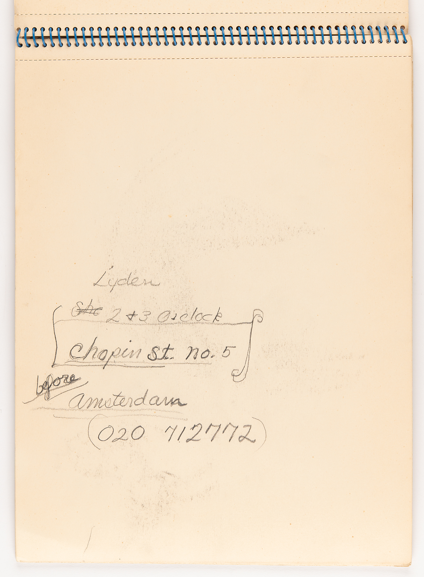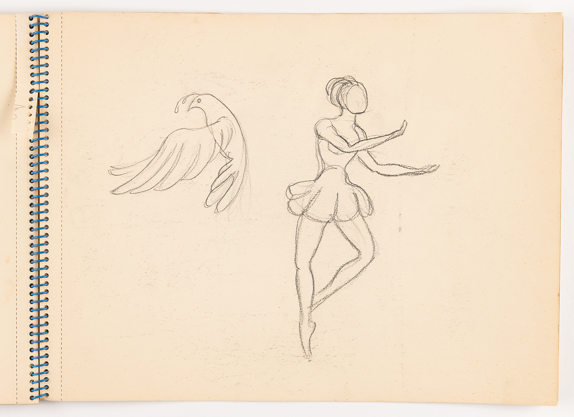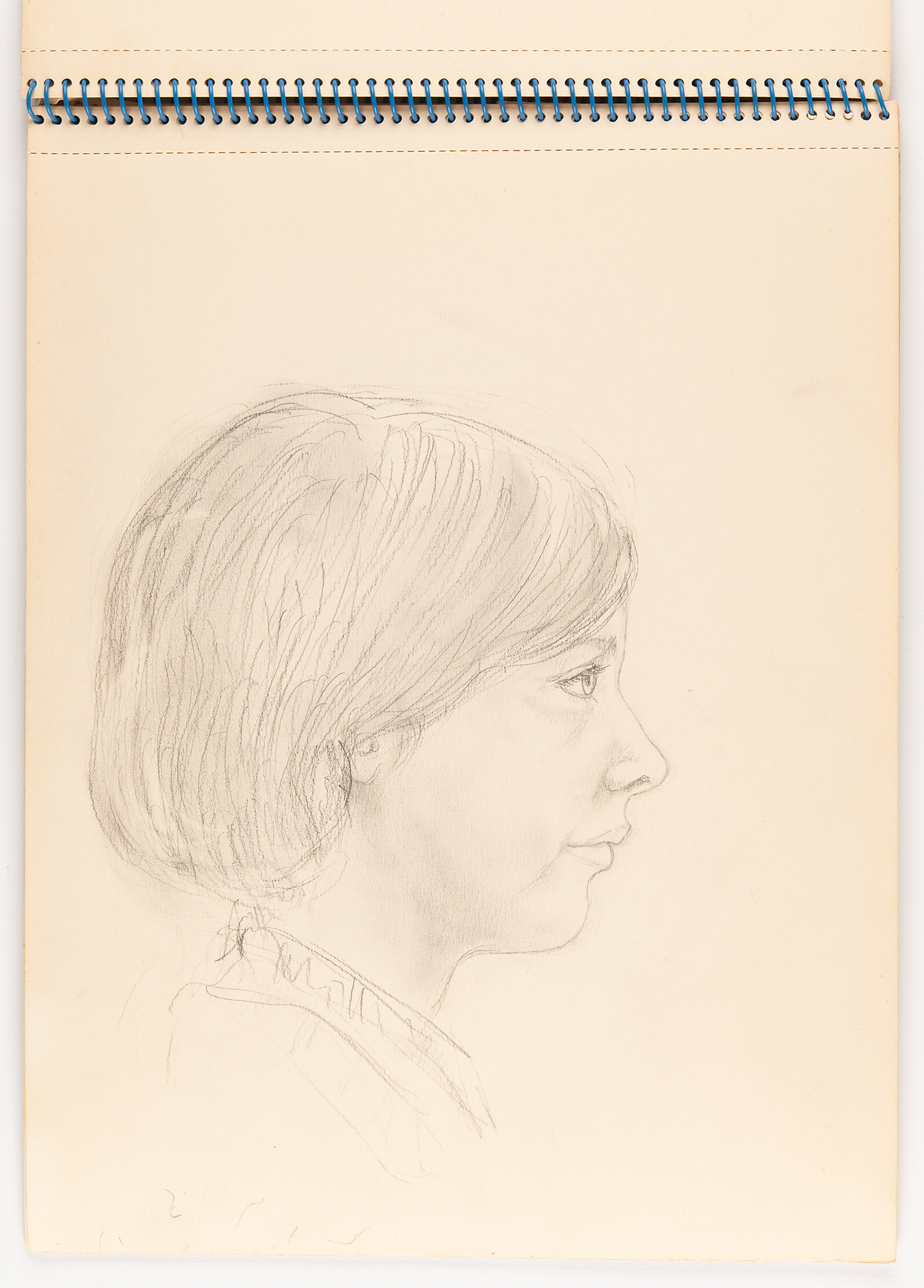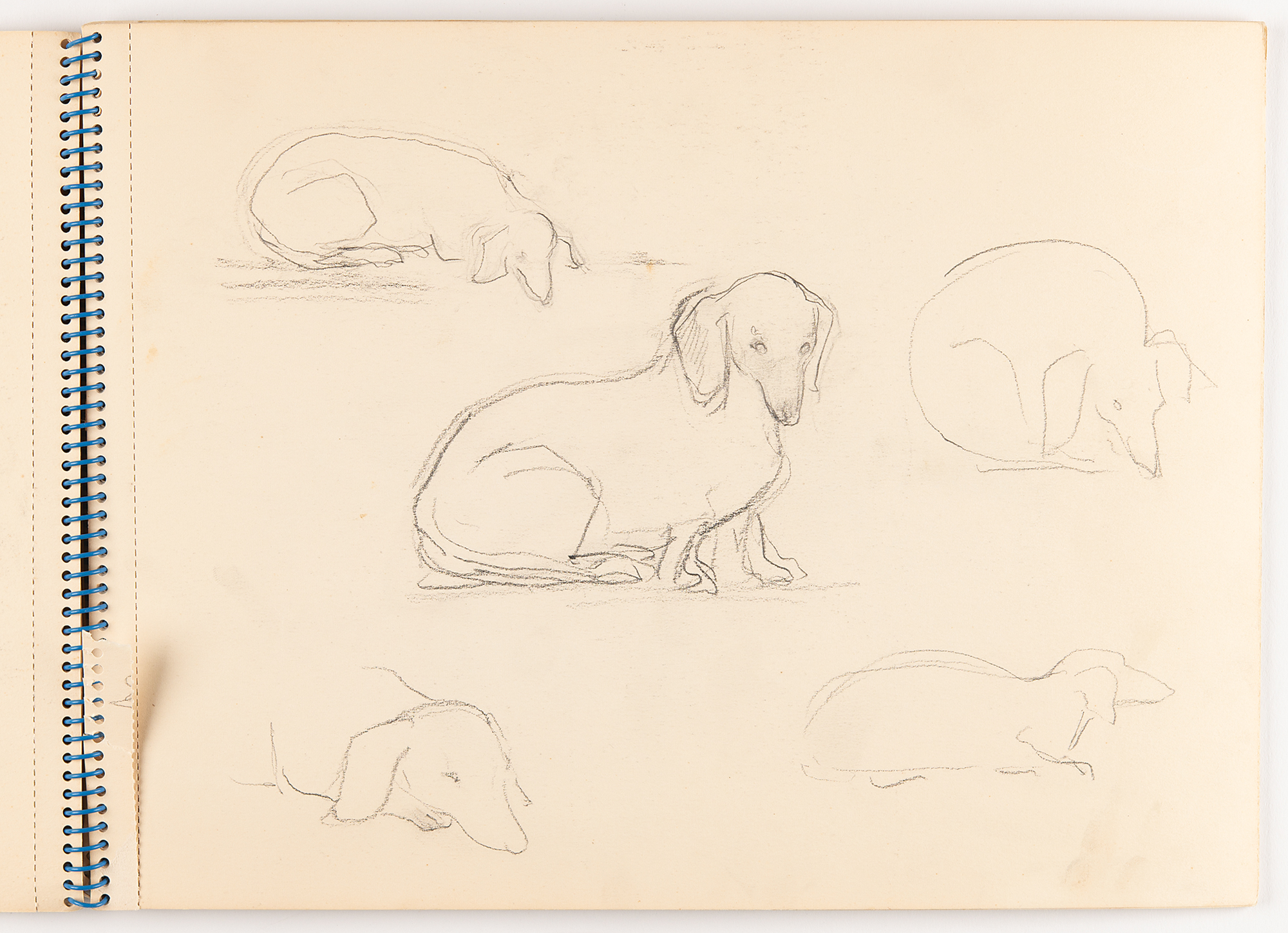 American actress, model, and socialite (1943–1971) known as one of Andy Warhol's superstars and muse to Bob Dylan. Edie Sedgwick's spiral-bound 12.75 x 9.5 'Studie Aquarel Bloc' sketch pad, containing eight original unsigned drawings in graphite (several back-to-back on a single leaf). Subjects are: a trotting horse, shown from the side; a trio of horse sketches, including a detailed, close-up portrait and two rough full-body sketches; a dove and a ballerina; five rough sketches of a small dog lying down; a detailed portrait of a girl and the dog; the same dog in five poses, rolling over and sitting up; a profile portrait of a young woman; and a rough side-view sketch of a horse. On one page, Sedgwick jots an address: "Lyden, 2 & 3 o'clock, Chopin St. No. 5, before Amsterdam, (020 712772)." On the front cover, she writes "beleive," "Budha," and "arose, arrose." In fine condition, with some damage only to the covers; interior pages are clean and unaffected.