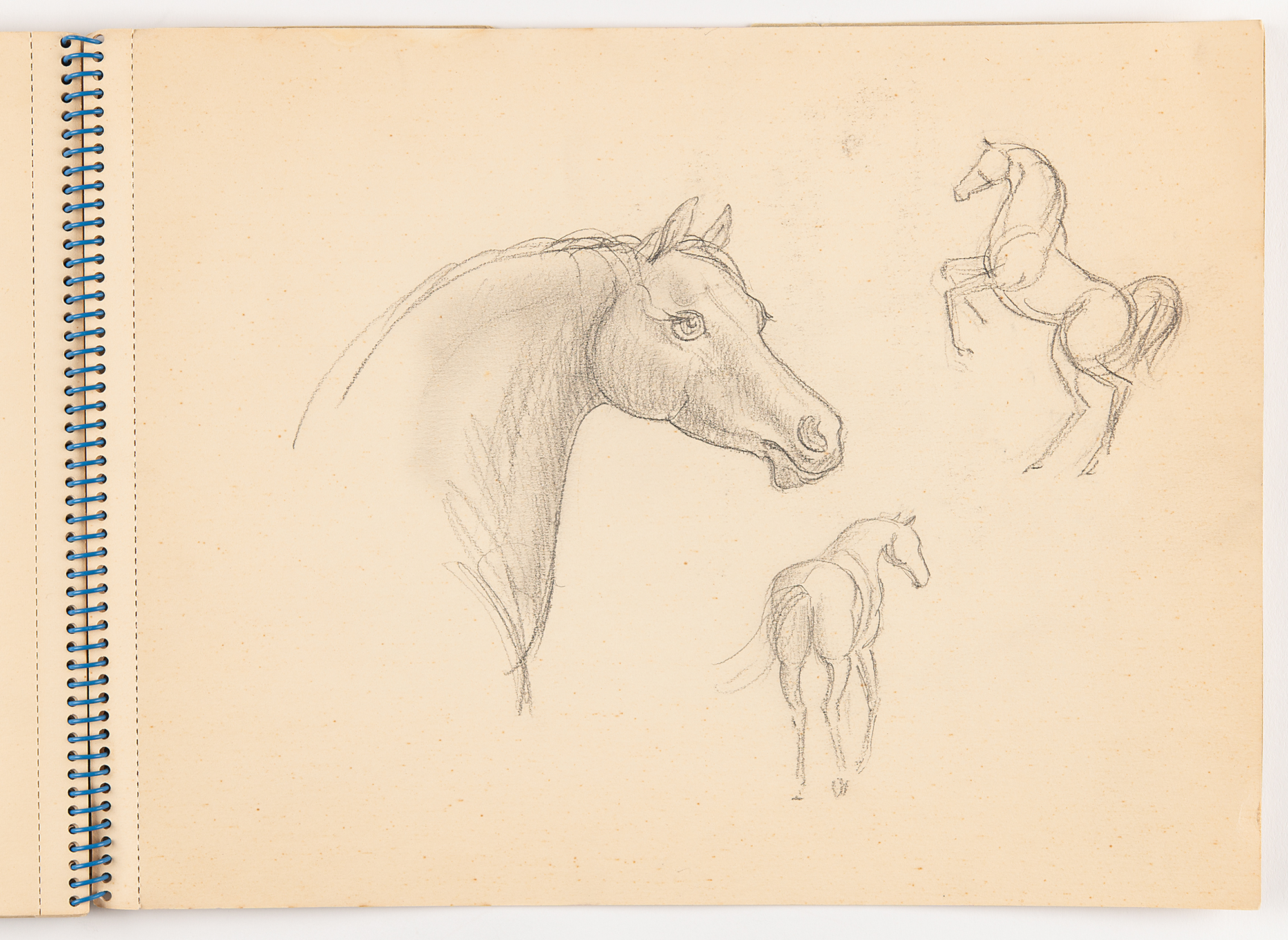 Sedgwick left the St. Timothy's School boarding school in 1959 and returned to her family’s La Laguna ranch in California, where she remained until the fall of 1962 when her family forced her to confront her eating disorder. At the age of 19, she was sent to the private Silver Hill psychiatric hospital in New Canaan, Connecticut, before eventually being moved to Bloomingdale, the Westchester Division of New York Hospital, residencies that allowed her to focus on artwork during occupational therapy sessions. These drawings portray Sedgwick's typical subject matter, including human figures and animals. She was especially fond of horses—an early love cultivated in her youth on the ranch—and often returned to them in her artwork.