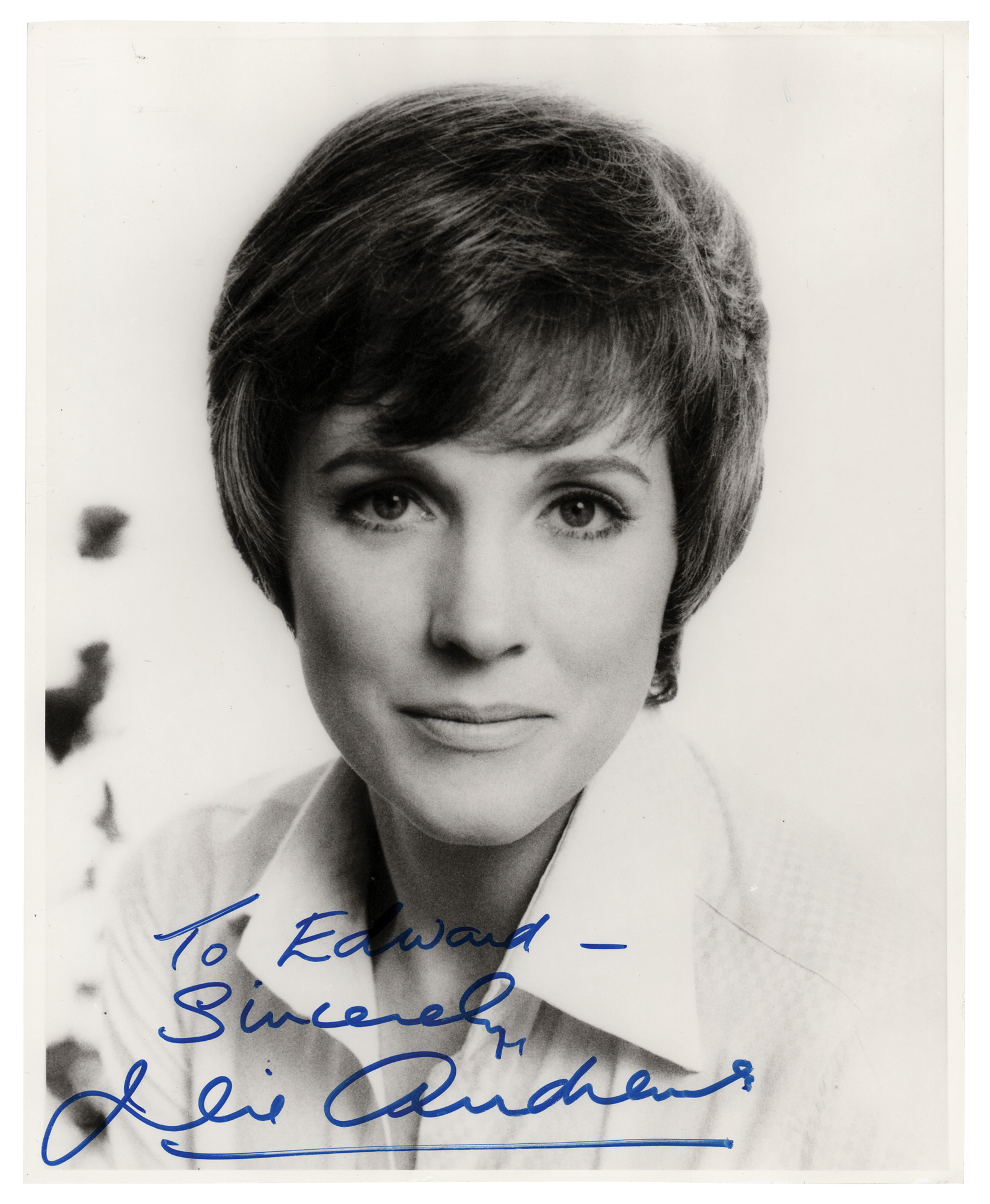 Semi-glossy 8 x 10 portrait of the celebrated actress and singer, boldly signed and inscribed in blue felt tip, "To Edward—Sincerely, Julie Andrews.” Reverse bears the credit stamp of noted British dance and theatre photographer Zoe Dominic. In fine condition, with light edge rippling.