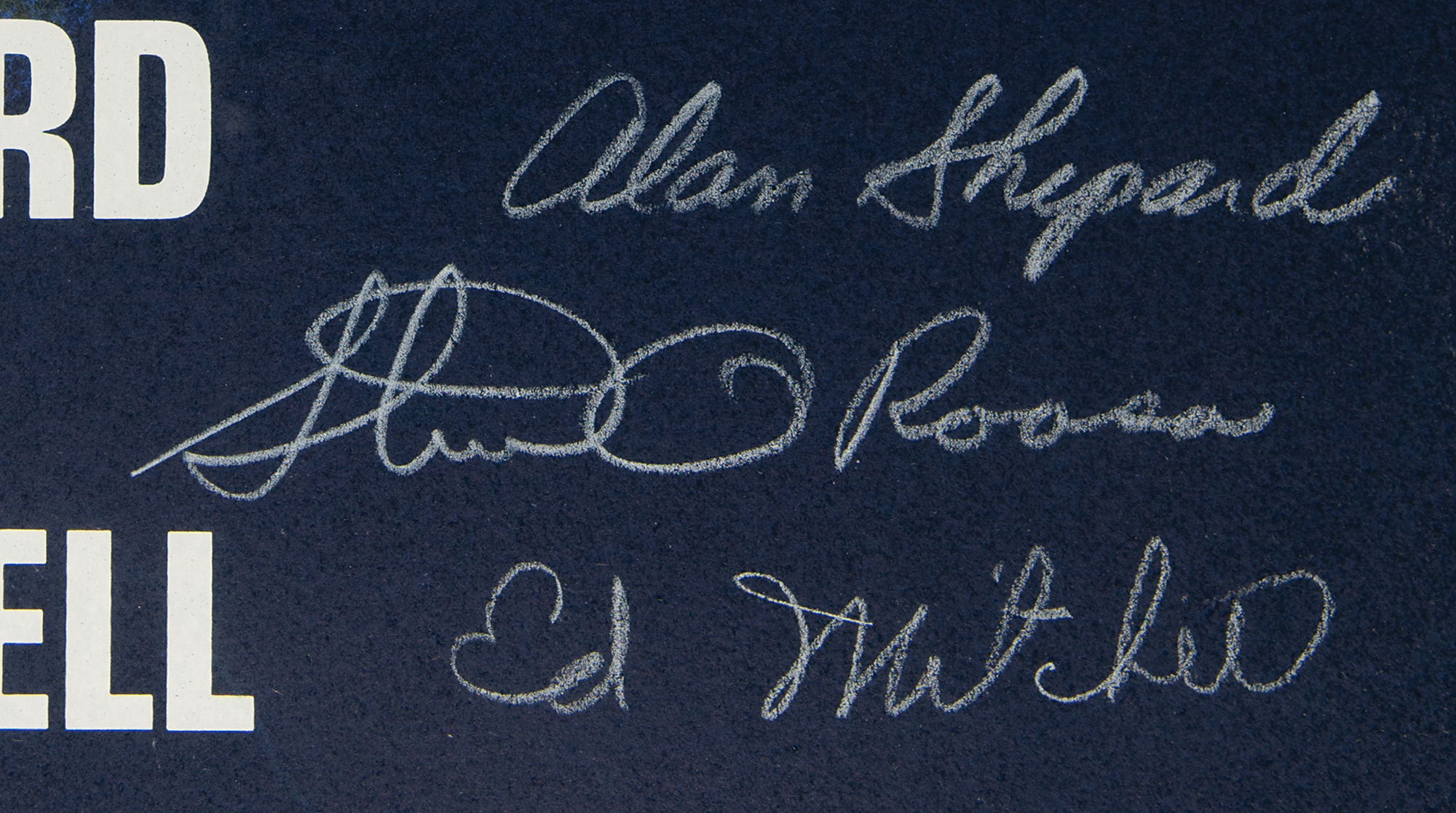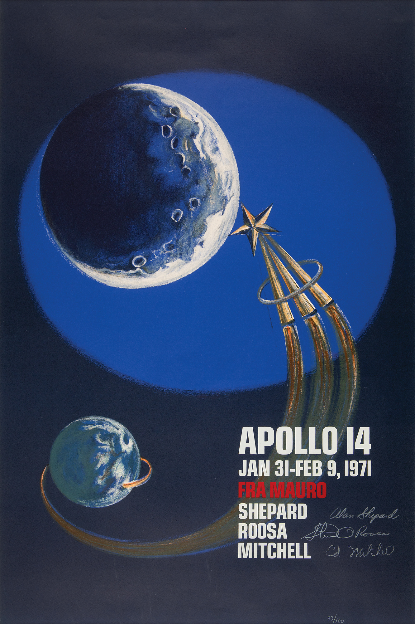 Striking color limited edition 21 x 32 silkscreen print honoring the Apollo 14 mission to the moon's Fra Mauro region, numbered 33/100, signed in white pencil by Alan Shepard, Stuart Roosa, and Ed Mitchell. Archivally matted and framed to an overall size of 28 x 38.5. In very fine condition.