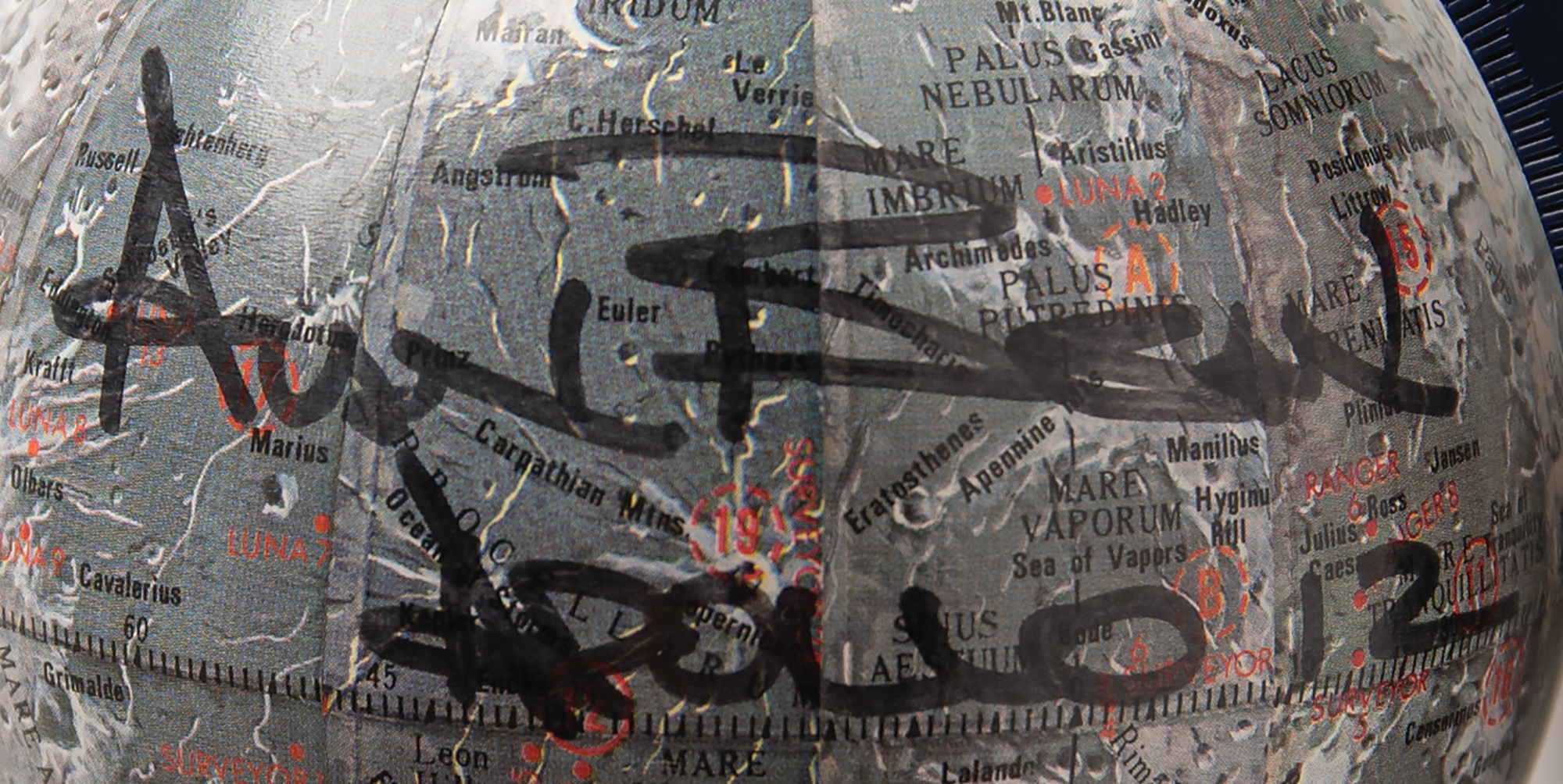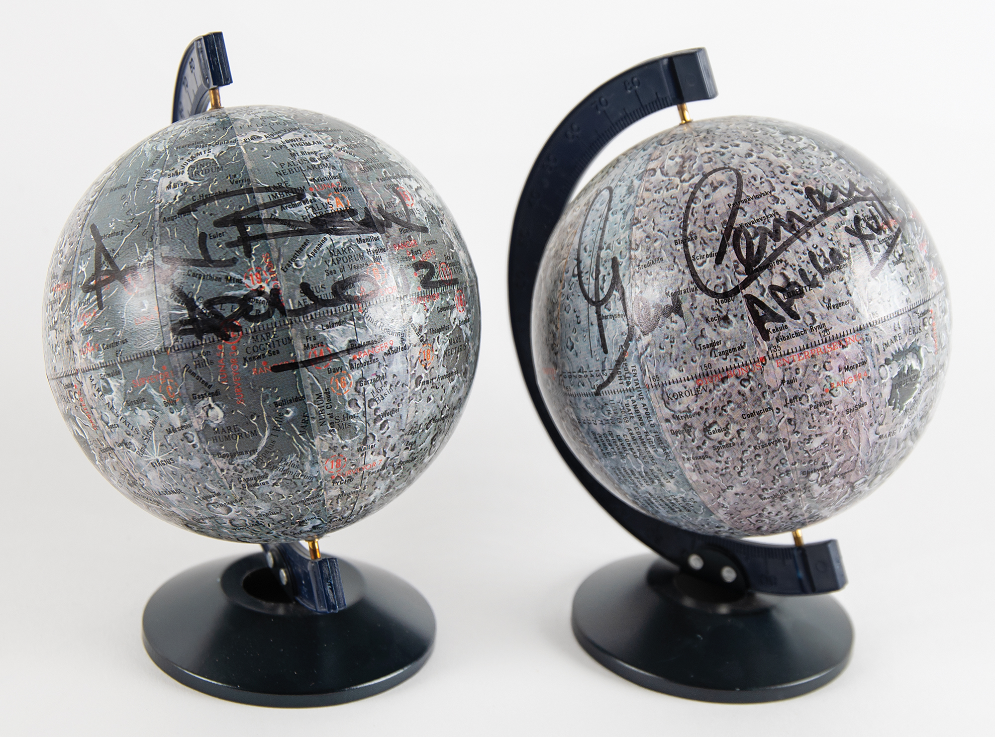 Two 4˝-diameter lunar globes produced circa 1970 by Bonus Enterprises, Inc., marked with the proposed Apollo landing sites, individually signed in black felt tip, "Alan Bean, Apollo 12" and "Gene Cernan, Apollo XVII." In overall fine condition.