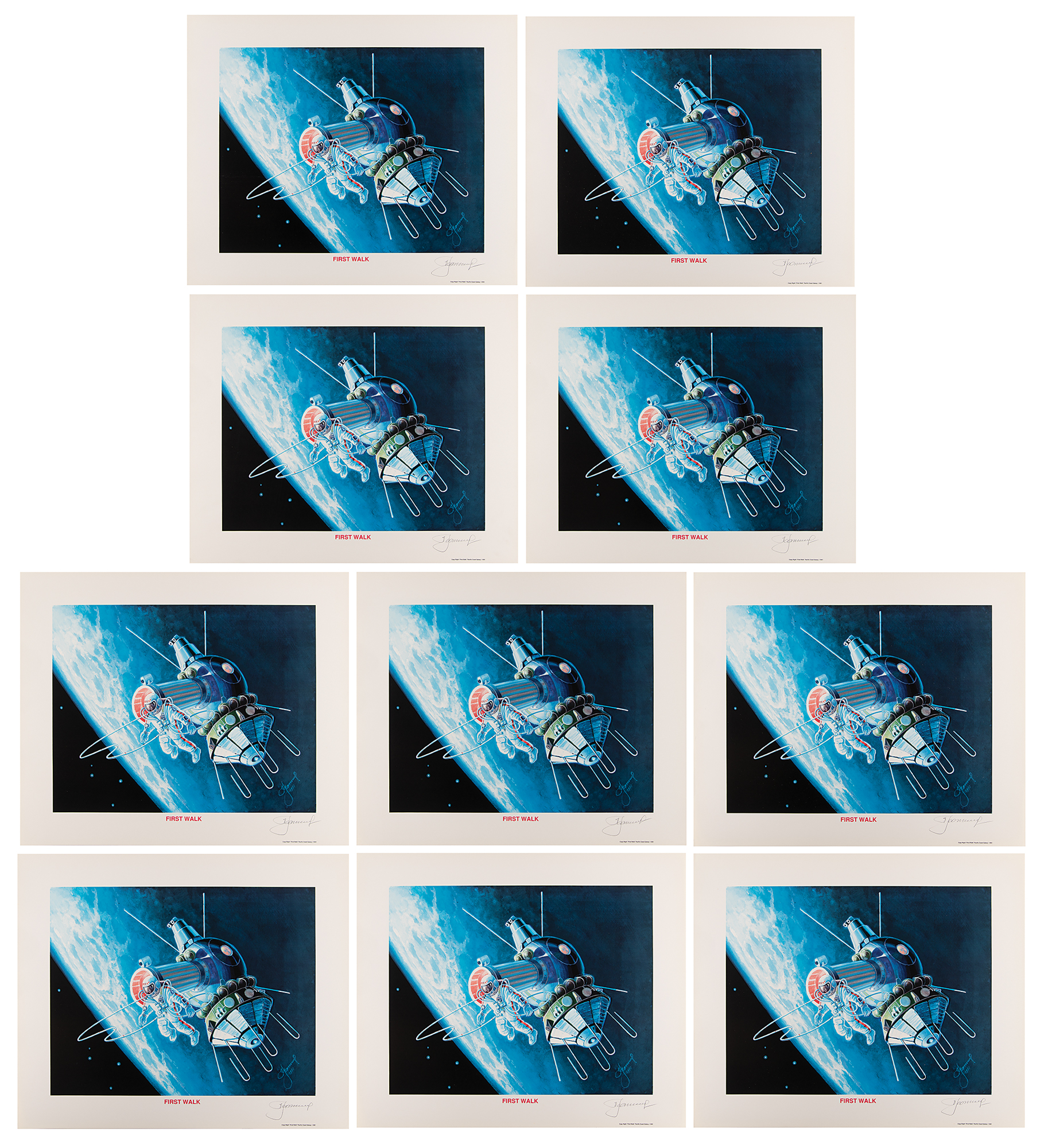 Group of 10 color 20 x 16.5 prints entitled 'First Walk,' featuring Leonov's own painting of his historic 12-minute spacewalk during the Voskhod 2 mission, signed in the lower border in pencil by Leonov. Published by Pacific Coast Galaxy in 1991. In overall fine condition.