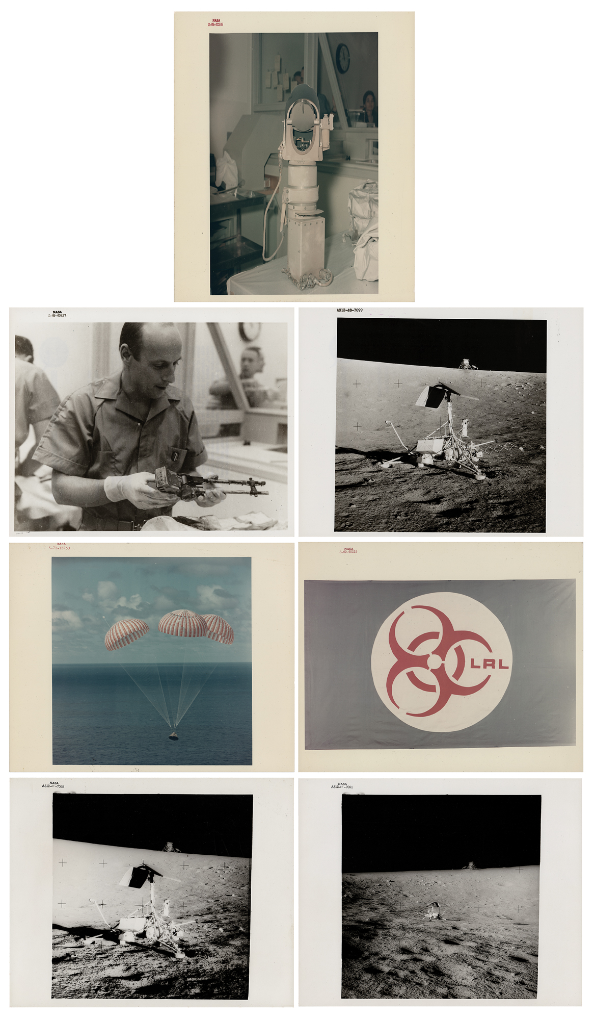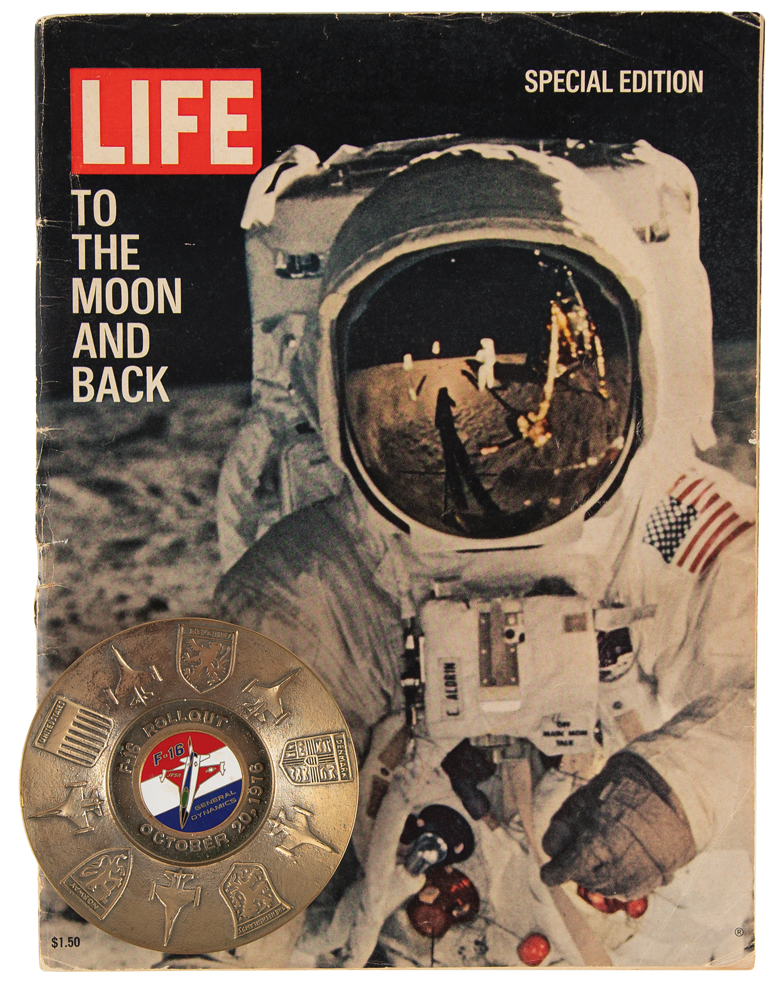 Also included: nine official glossy NASA photographs and seven official NASA lithographs; special edition of the Life magazine’s ‘To the Moon and Back’ issue; stapled NASA manual entitled ‘Aerospace Physiological Training Outline,’ September 1969; Apollo 11 Mission Report booklet (MR-5); article booklet entitled ‘Results of Apollo 11 and 12 Quarantine Studies on Plants’; article booklet entitled ‘Apollo 11: Exposure of Lower Animals to Lunar Material’; NASA booklet entitled ‘On the Moon with Apollo 16: A Guidebook to the Descartes Region’; unused ‘Apollo 11 Lunar Team’ sticker with astronaut Snoopy on his doghouse; GAF slide tray with approximately 80 color slides from the Apollo program; bronze-tone ashtray for the 1976 rollout of the General Dynamics F-16 Fighting Falcon; two 7-inch film reels (unknown content), and more. In overall very good to fine condition, with scattered wear of varying degrees to the rolled Surveyor photos and the Apollo charts, which includes creases and tears, and peeling to the laminated access badges.