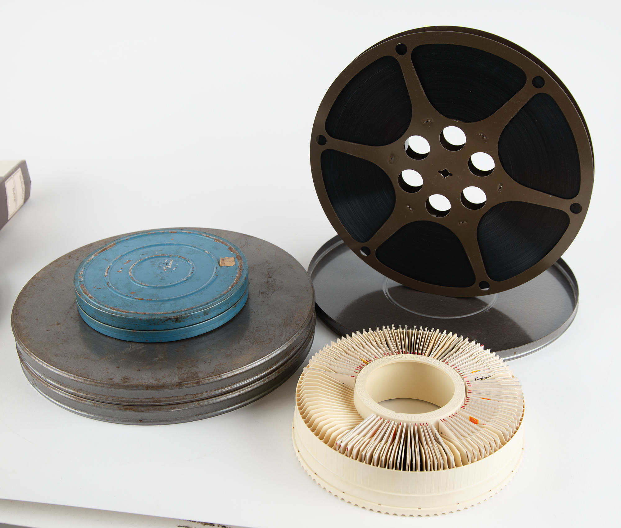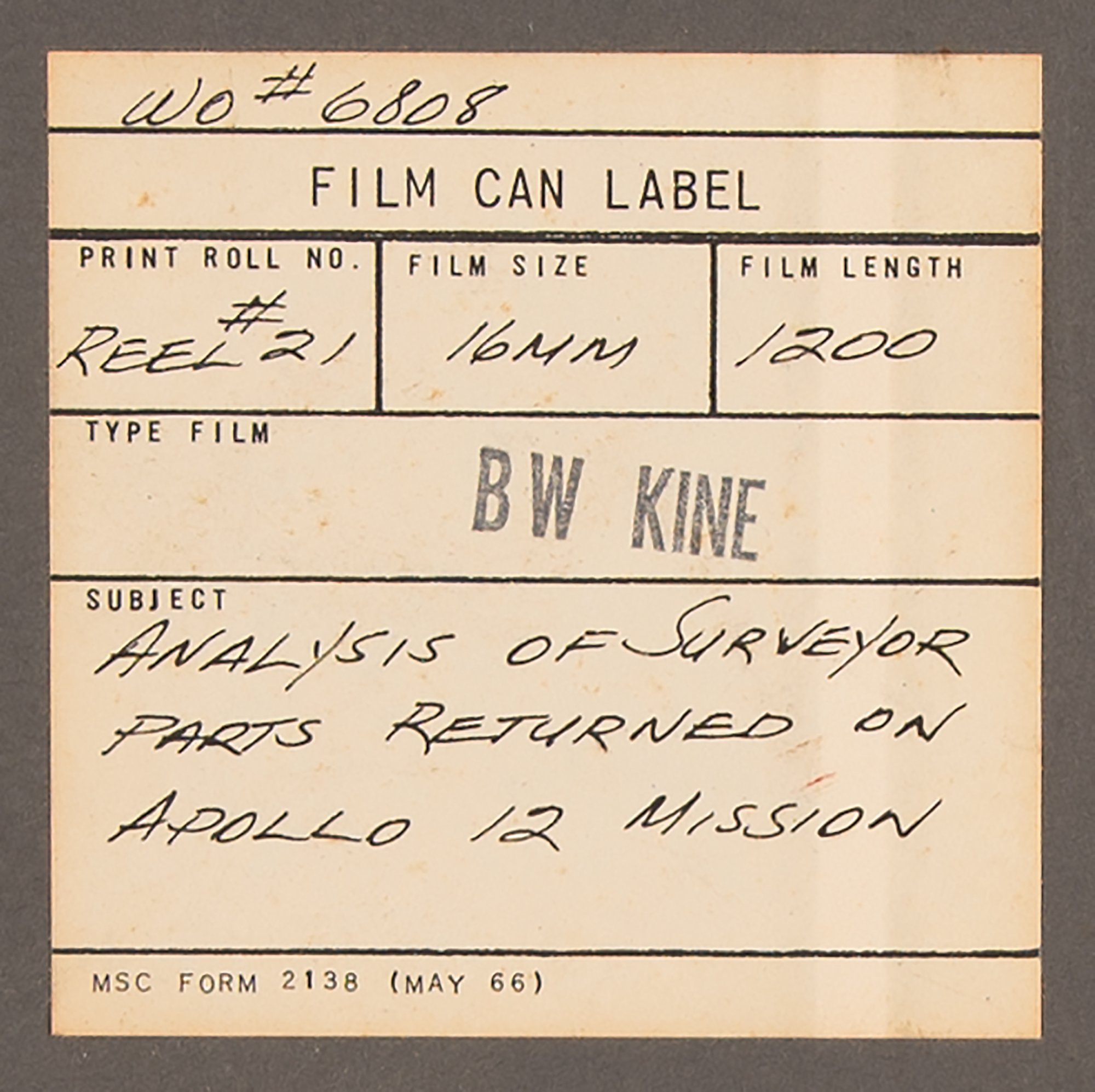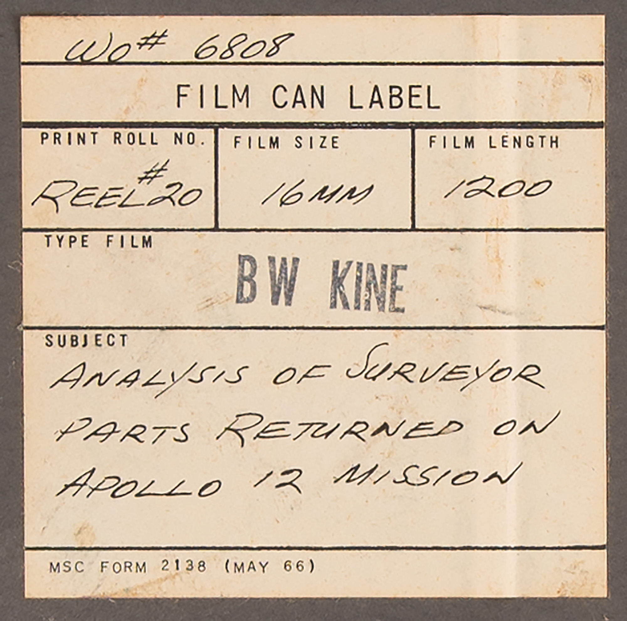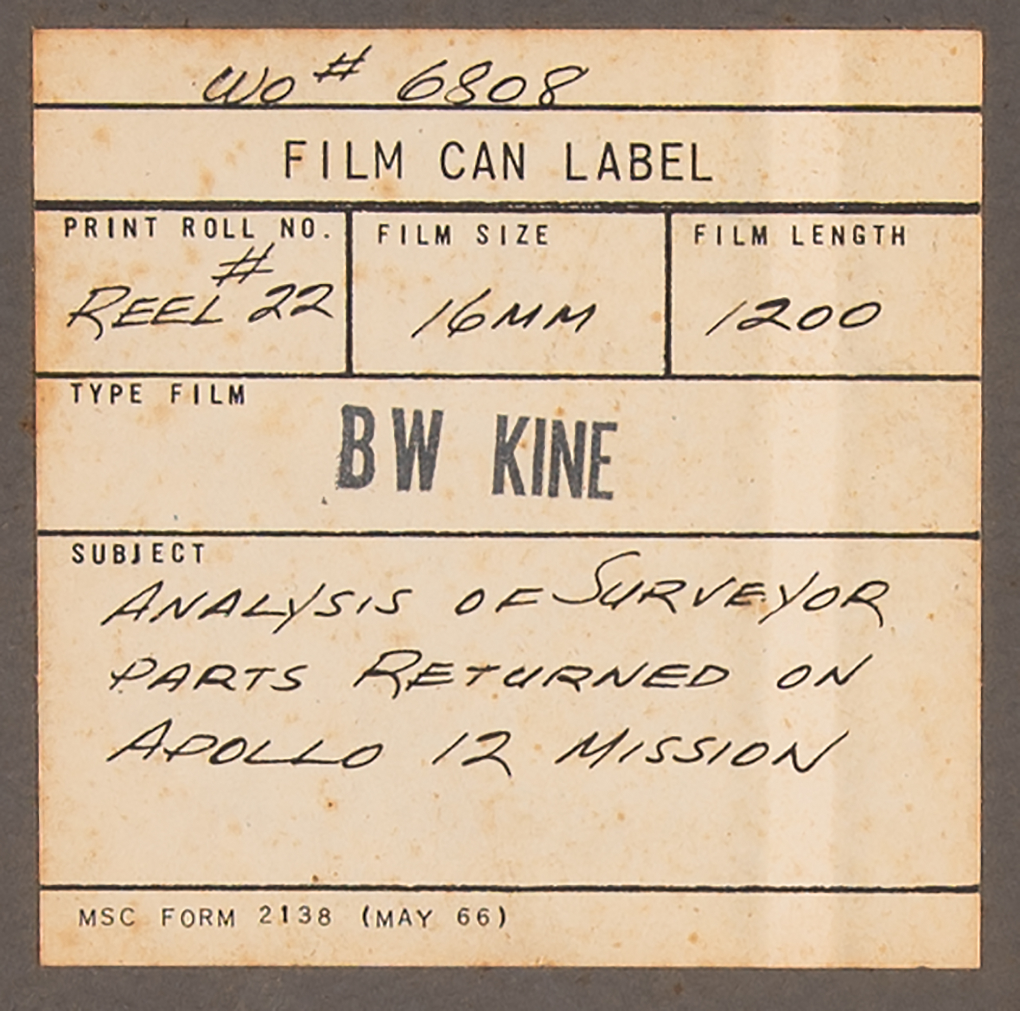 - Three 12.5˝ film cans, each containing 16mm film reels with matching subject captions: “Analysis of Surveyor Parts Returned on Apollo 12 Mission”