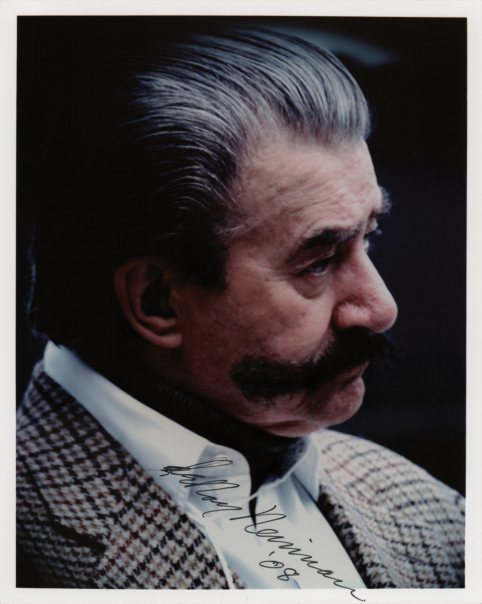Color satin-finish 8 x 10 close-up photo of the celebrated artist showing off his trademark mustache, signed in black felt tip, "LeRoy Neiman, '08." In fine condition, with a PSA/DNA label affixed to the reverse. Accompanied by a certificate of authenticity from PSA/DNA.