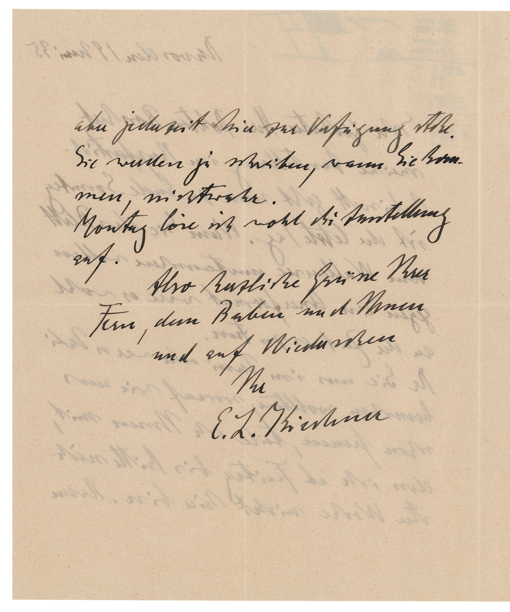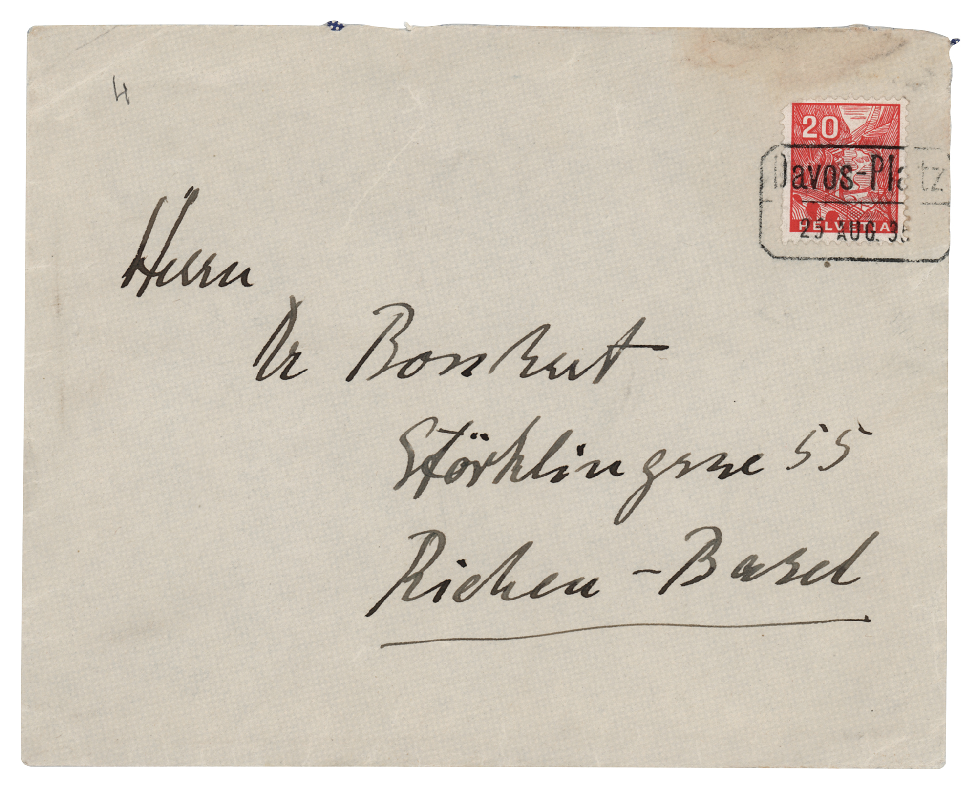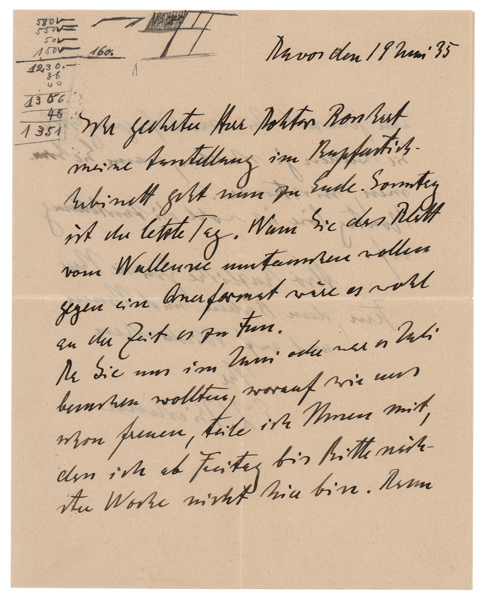 German painter and printmaker (1880–1938) who was instrumental in creating the style that defined 'Expressionism' in 20th-century German art. ALS in German, signed “E. L. Kirchner,” one page both sides, 8.5 x 10.75, June 19, 1935. Untranslated handwritten letter about the end of an exhibition in Basel and the exchange of a watercolor from that exposition. In fine condition. Accompanied by the original mailing envelope, addressed in Kirchner's hand.