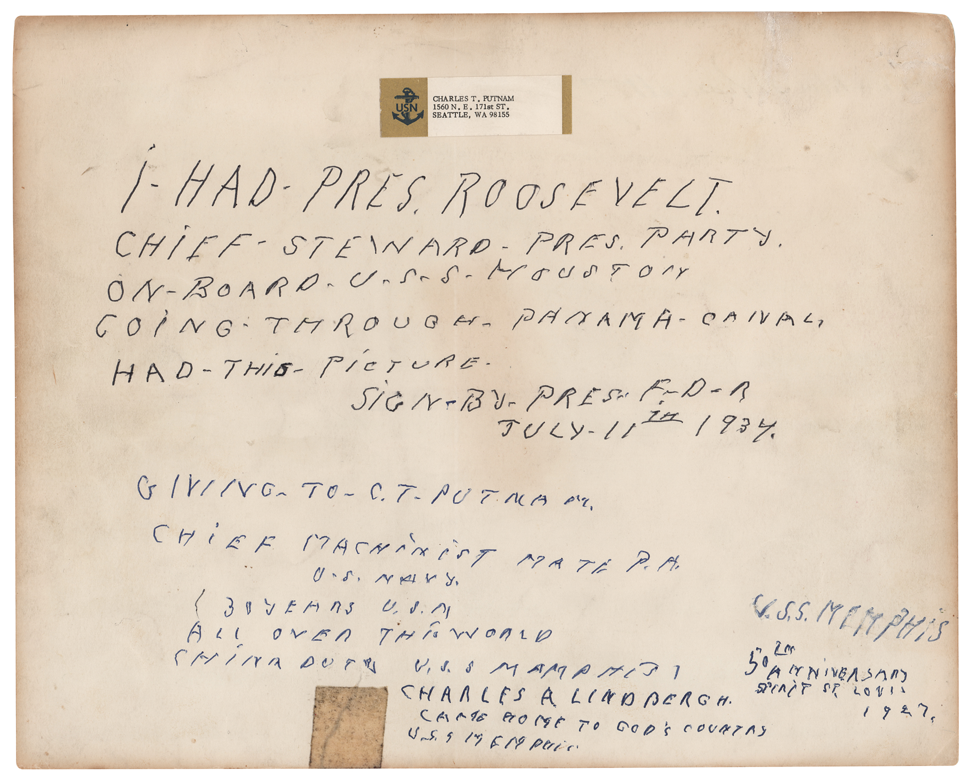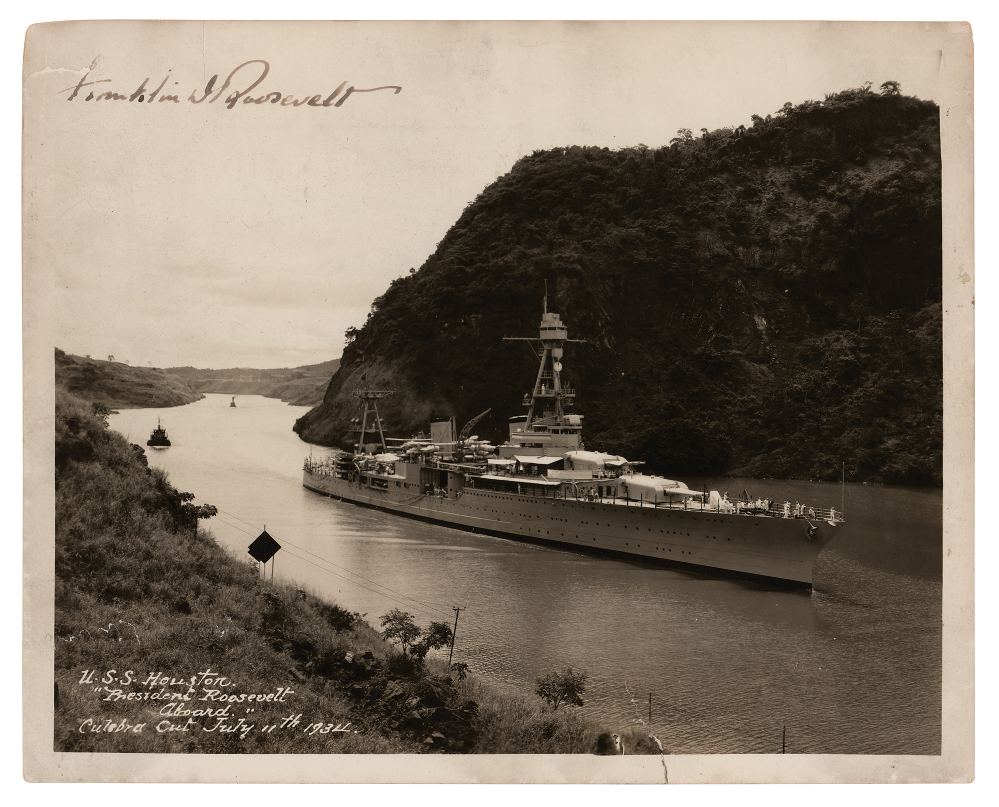 Vintage glossy 10 x 8 photo of the USS Houston sailing through the Panama Canal with FDR on board, captioned in the lower left, "U.S.S. Houston, 'President Roosevelt Aboard,' Culebra Cut, July 11th 1934," neatly signed at the top in fountain pen, "Franklin D. Roosevelt." Annotated on the reverse with interesting provenance information, describing it as a gift to Charles T. Putnam, a machinist mate in the US Navy. In very good condition, with creasing, a repaired edge tear, and heavy surface impressions from the copious notes on the reverse.