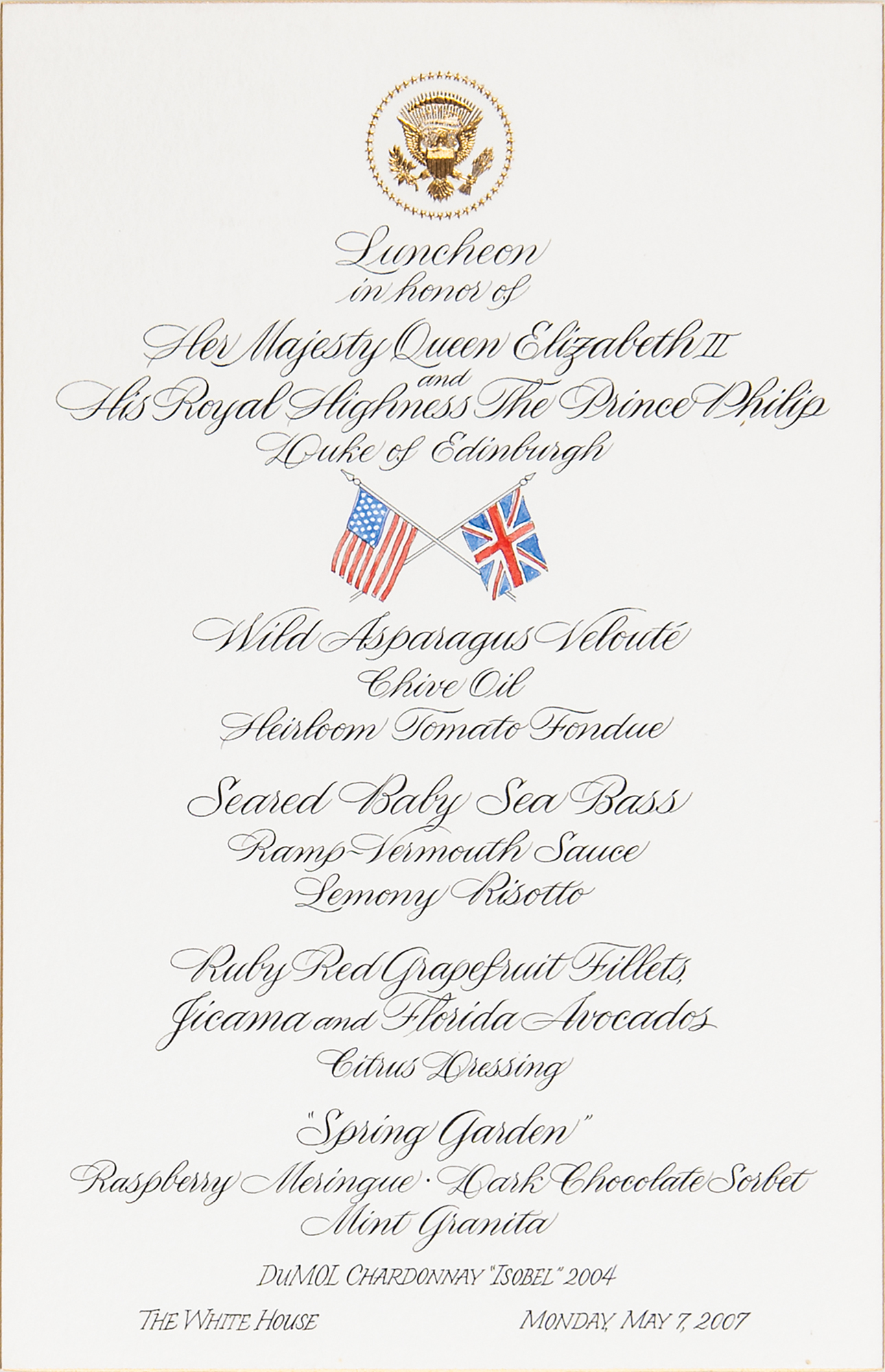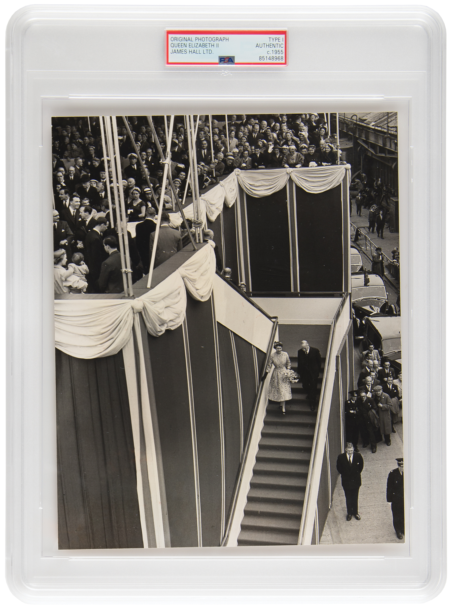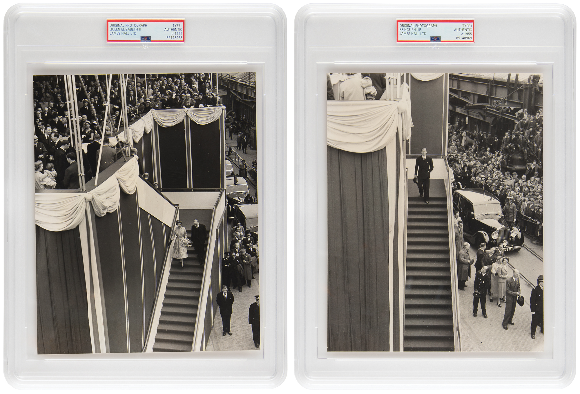 Desirable pairing of original vintage circa 1955 semi-glossy 7.5 x 9.5 silver gelatin photographs showing Queen Elizabeth II and Prince Philip descending a tall staircase with crowds of onlookers in the stand and street, both taken by James Hall, 38 Union Street, Greenock. Both bear Hall's credit stamp on the reverse, and both are encapsulated by PSA as authentic 'Type I' photographs. In overall fine condition. Accompanied by a much later original White House luncheon menu from their visit to the United States on May 7, 2007.
