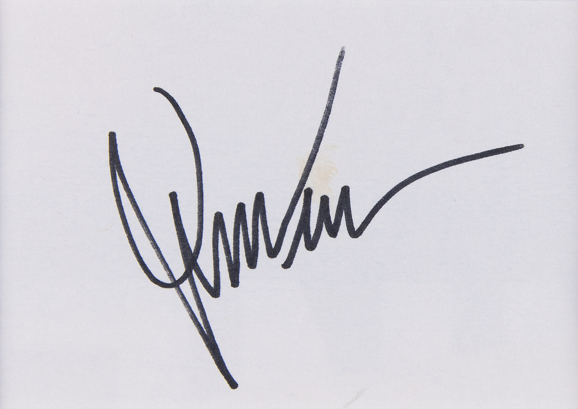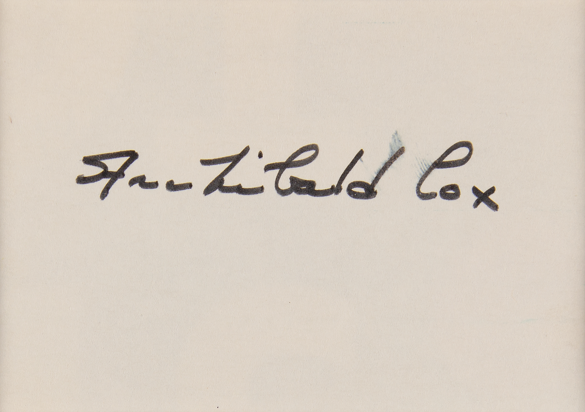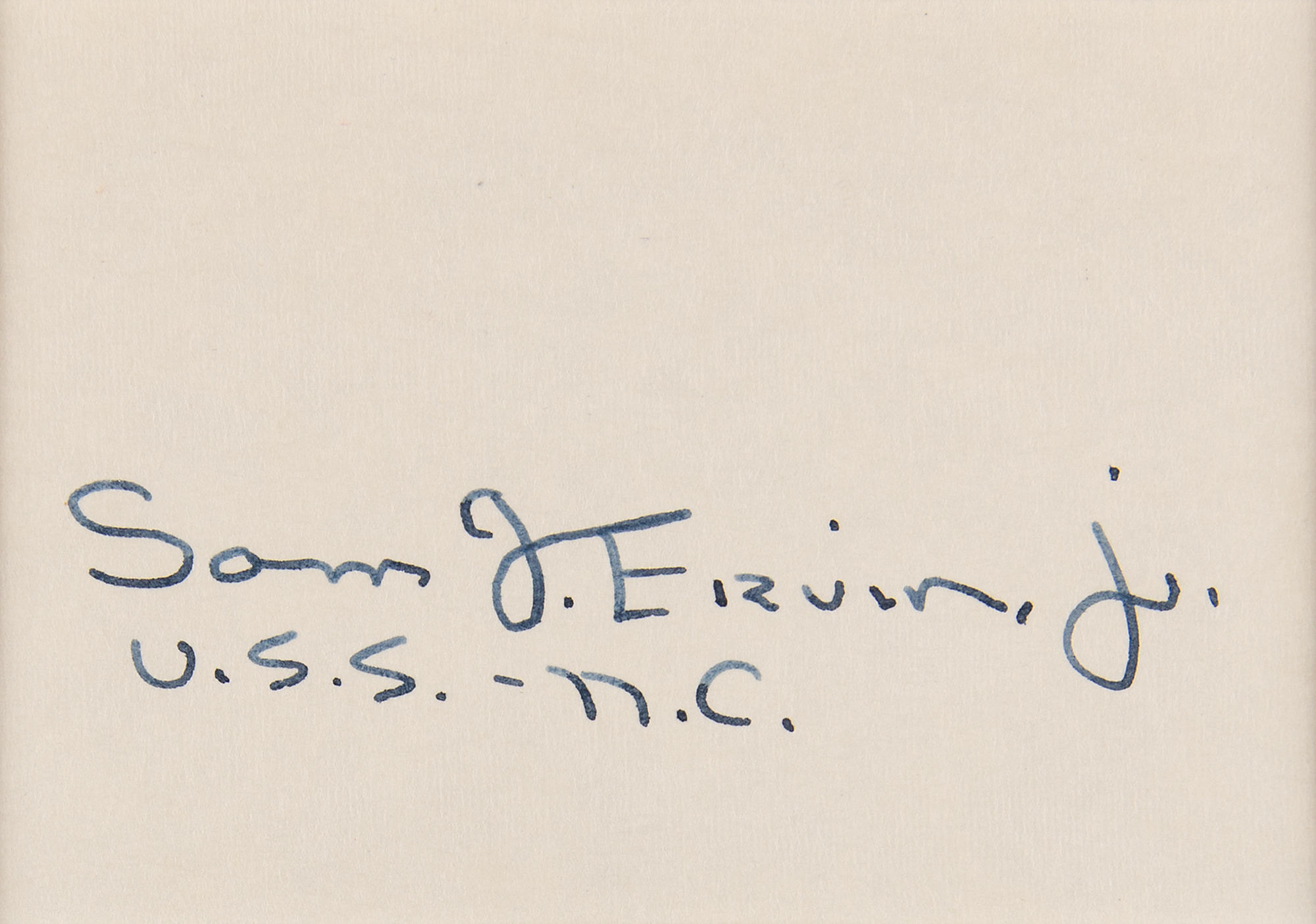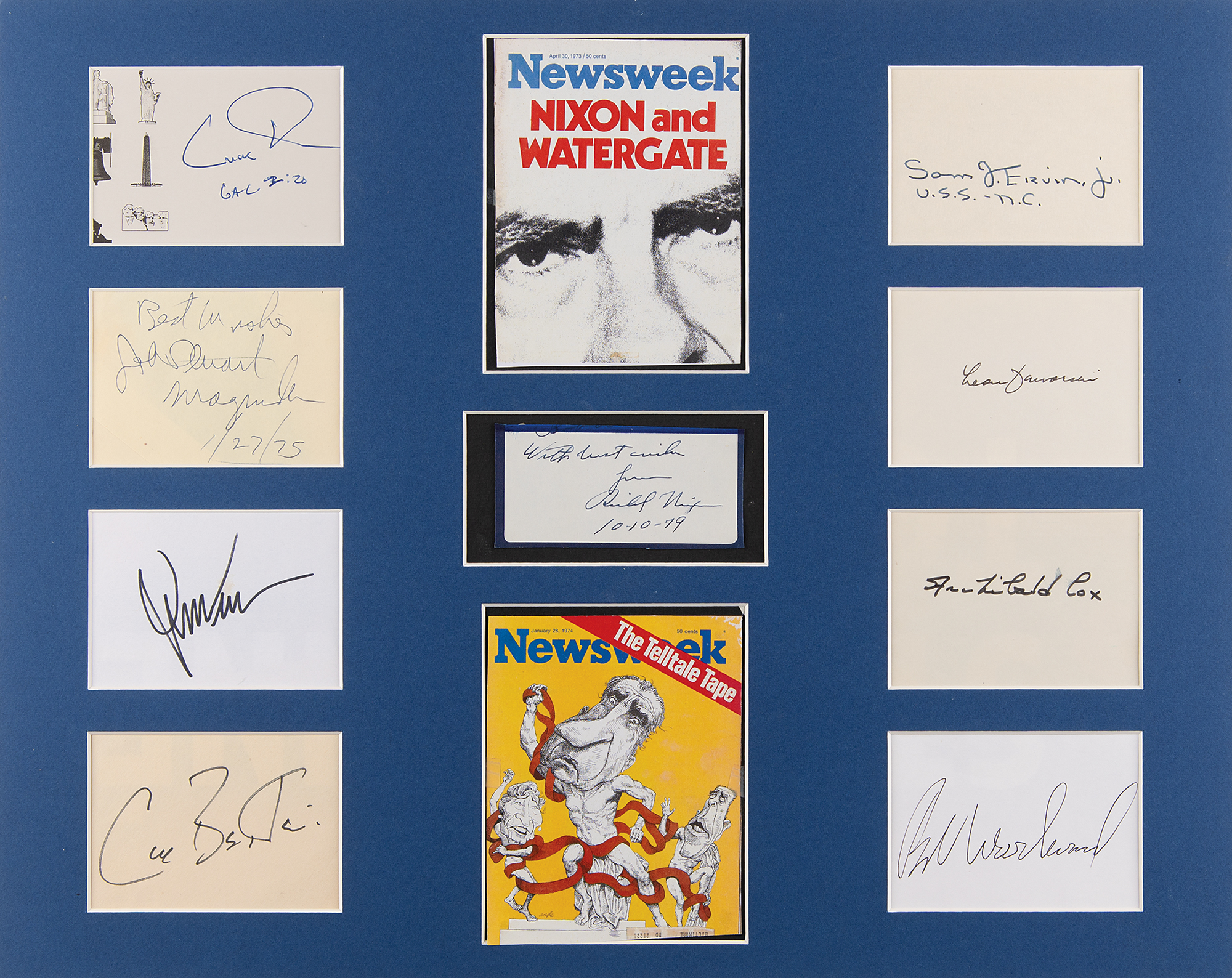 Nine ink signatures of major figures involved in the Watergate scandal—President Richard Nixon, Bob Woodward, Carl Bernstein, Sam Ervin, Archibald Cox, Jeb Stuart Magruder, Leon Jaworski, John Dean, and Chuck Colson—on individual cards and slips, matted with two images of related Newsweek covers to an overall size of 19.75 x 15.75. In fine condition.