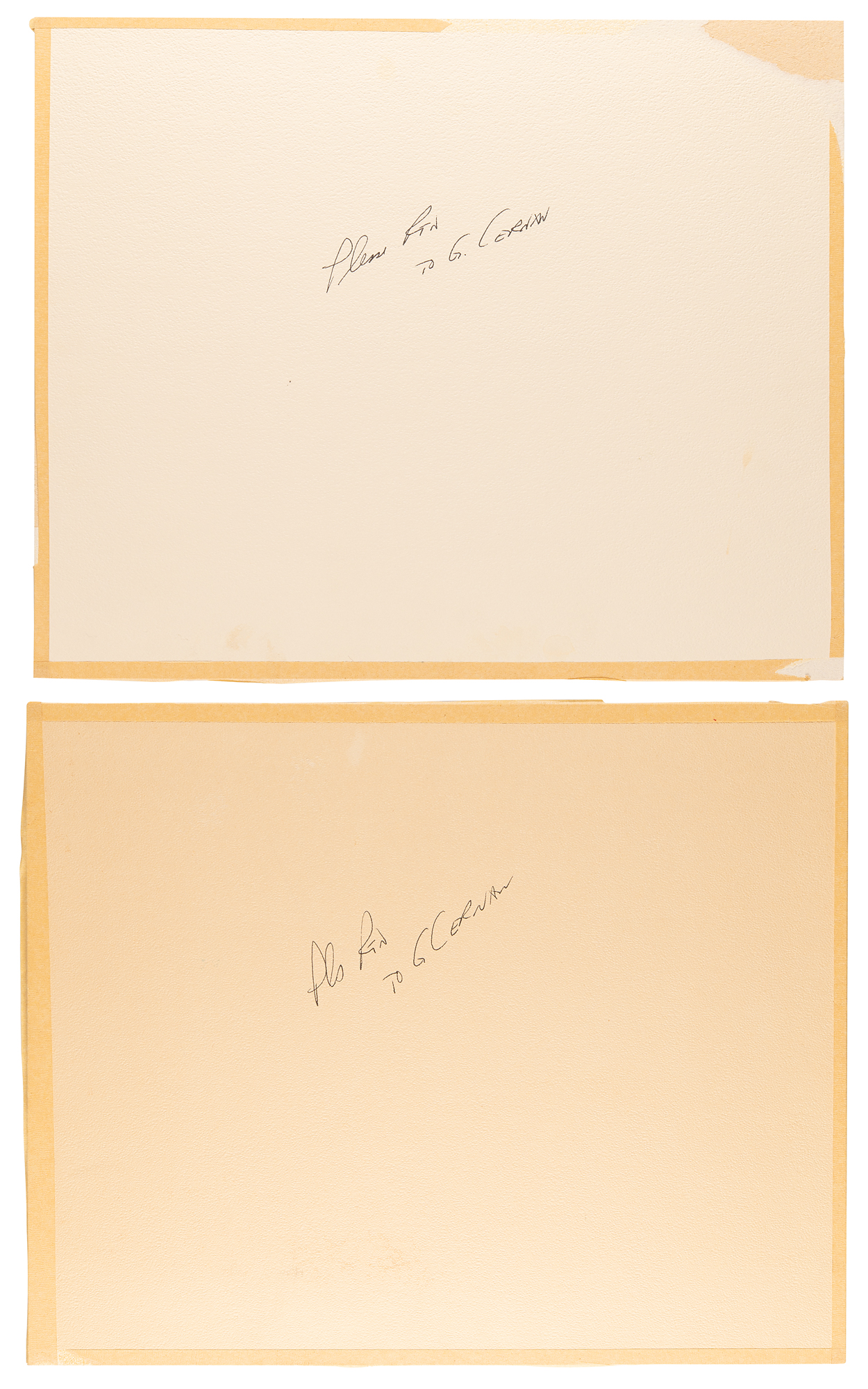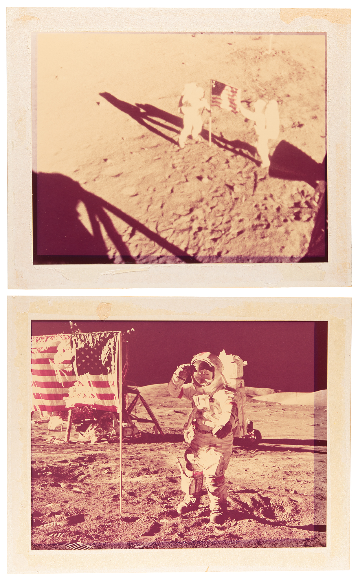 Gene Cernan’s pair of official color semi-glossy NASA photographs, both 13.75 x 10.75 and affixed to their original 16 x 13 cardstock mounts, the reverse of both annotated in black ink by Cernan, “Please Ret to G. Cernan” and “Pls Ret to G. Cernan.” The images show astronauts Neil Armstrong and Buzz Aldrin raising the United States flag at the Apollo 11 lunar landing site and CDR Gene Cernan saluting the American flag during the Apollo 17 mission. In overall very good to fine condition, with adhesive remnants and wear to borders, and uniform boxes of toning from prior displays.
