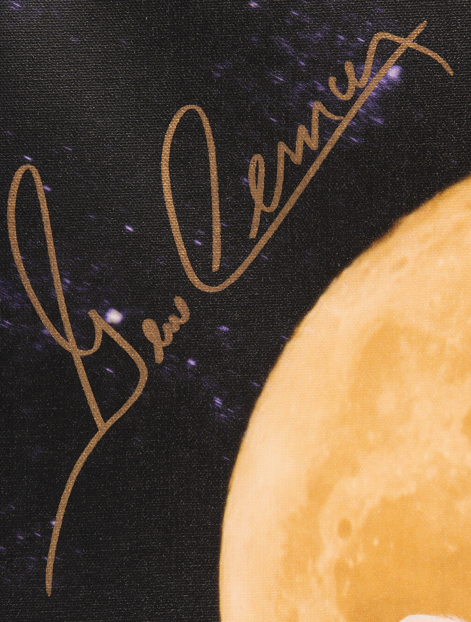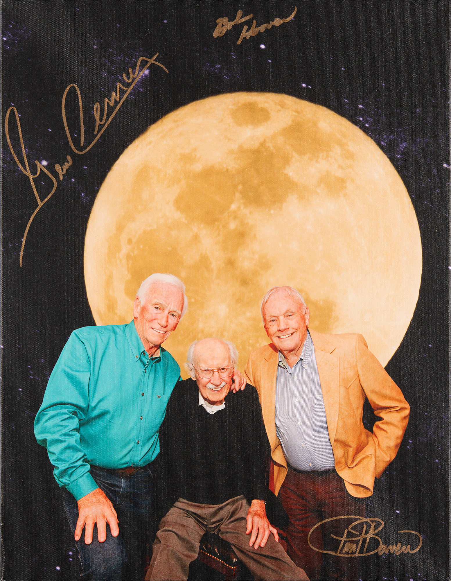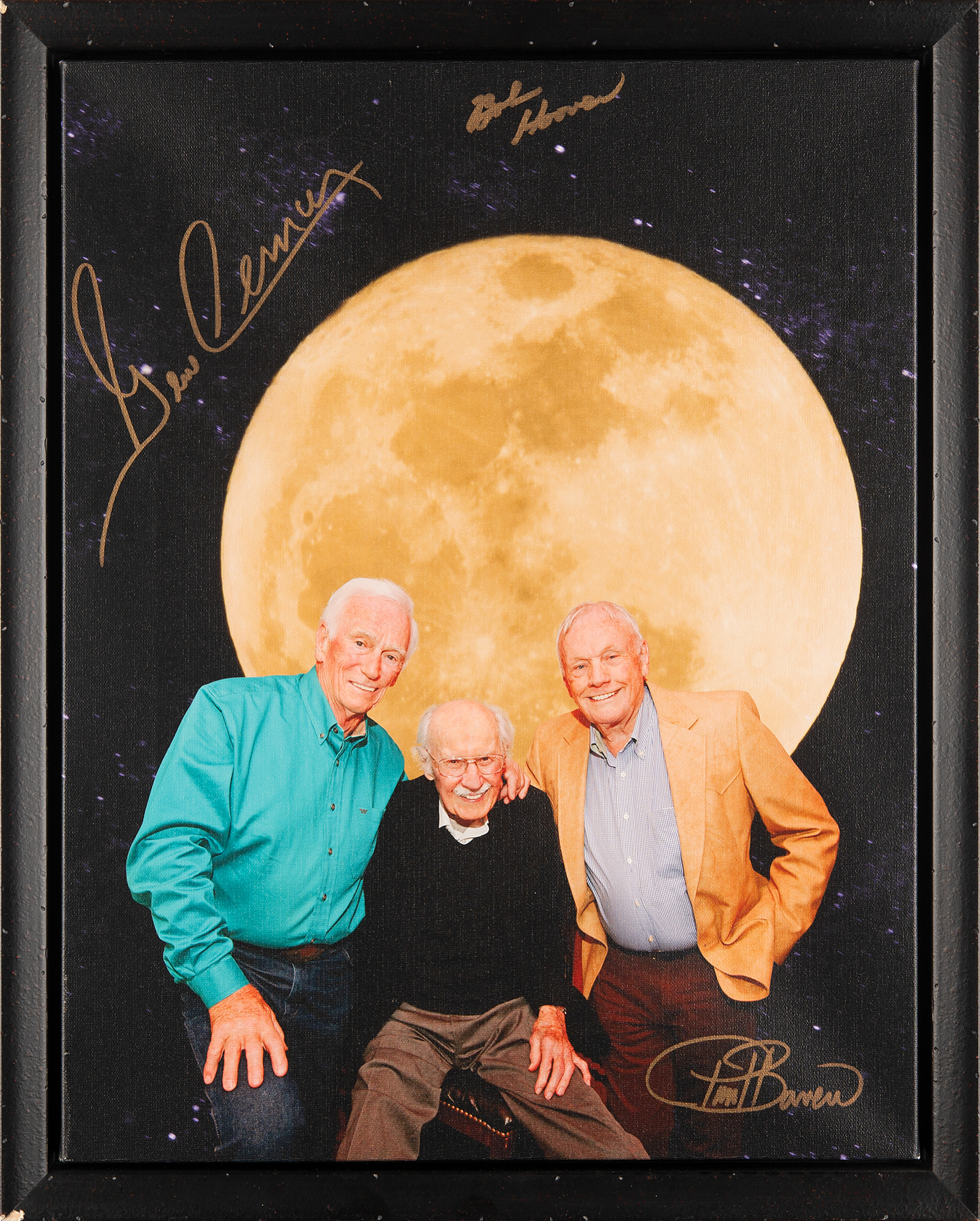 Wonderful color 16.25 x 20.75 photographic print on stretched canvas by Paul Bowen, which depicts the first and last Apollo moonwalkers, Neil Armstrong and Gene Cernan, posing with legendary aviator Bob Hoover against a large lunar backdrop, signed prominently in gold ink by Cernan and Hoover. The lower portion is signed by the photographer. Framed without glass to an overall size of 18.5 x 23. In fine condition, with light wear to the frame.